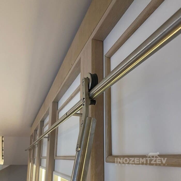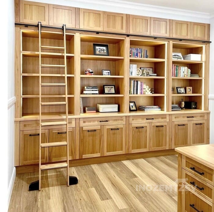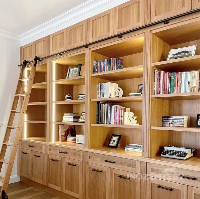 Большой шкаф с полками для книг, подсветкой и мобильной лестницей