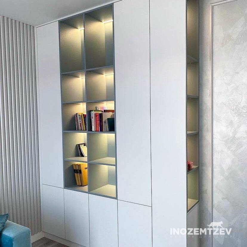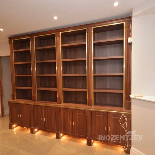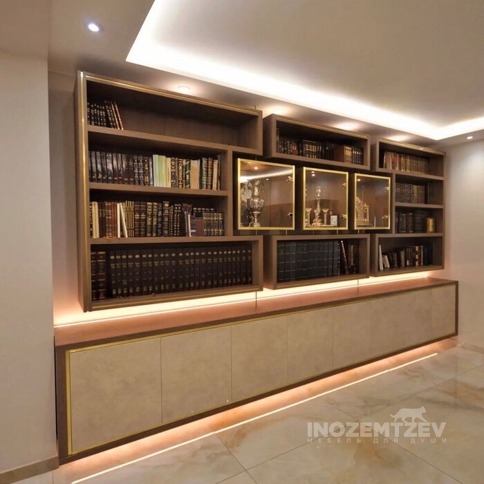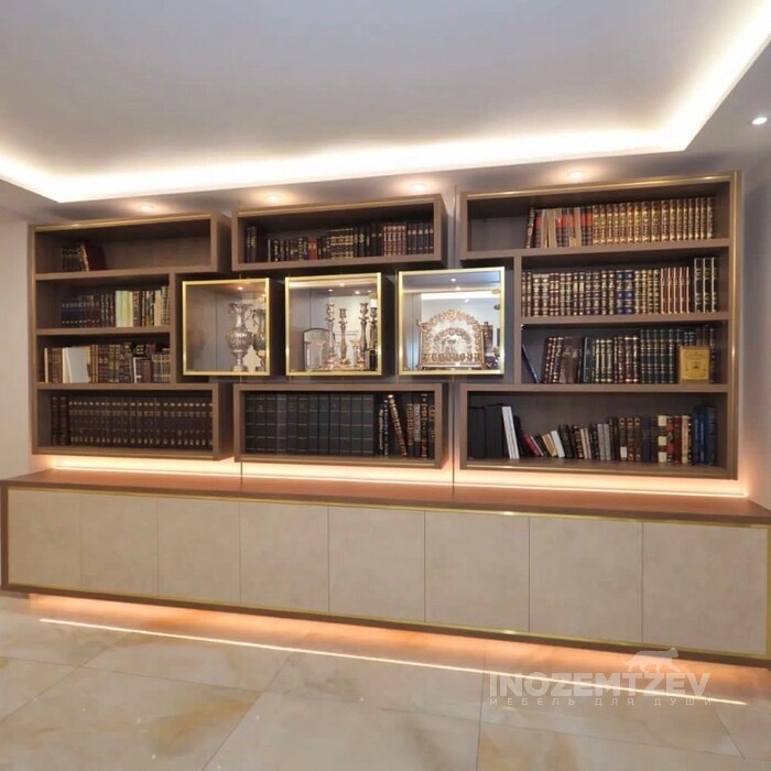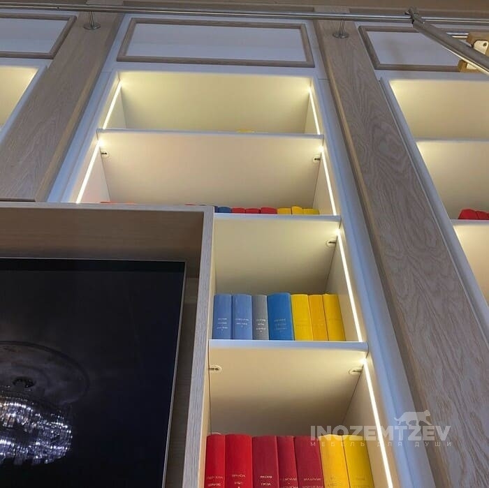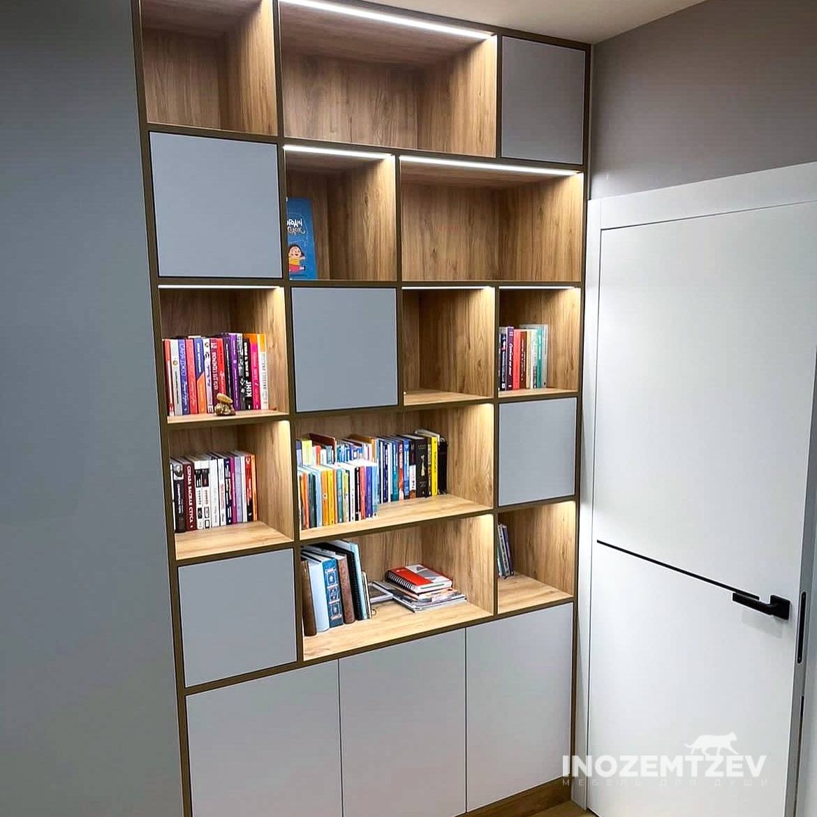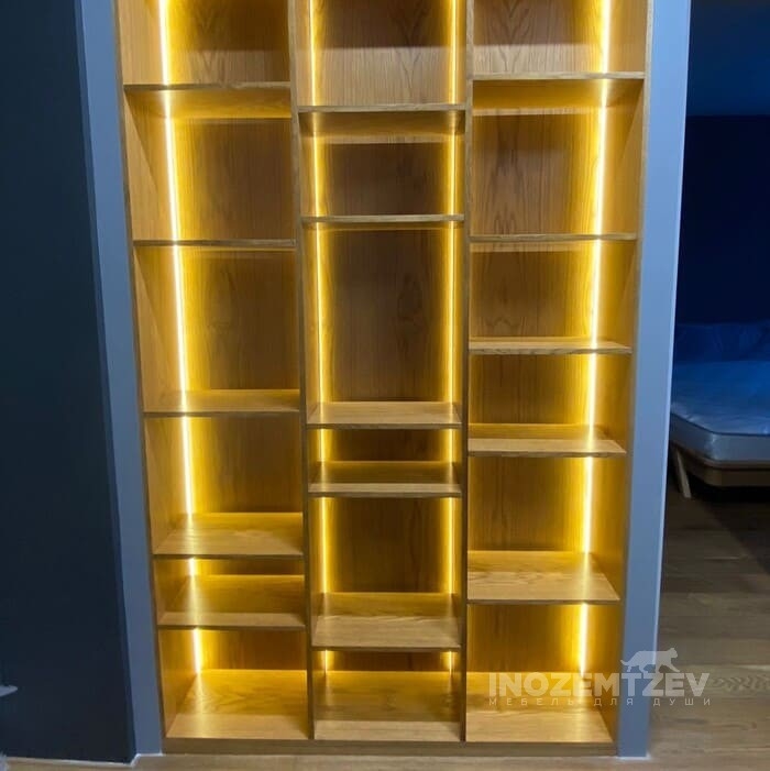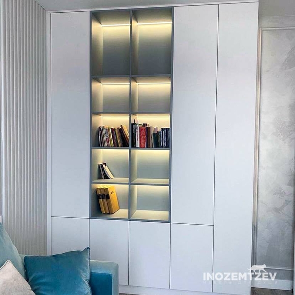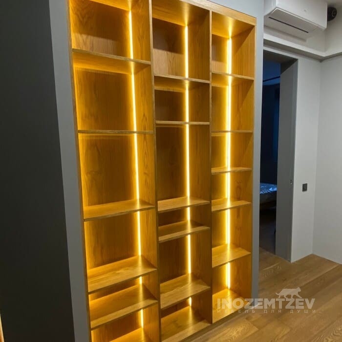 Книжный шкаф с подсветкой с открытыми и закрытыми полками в гостиную и шкаф в нишу с большой открытой полкой
