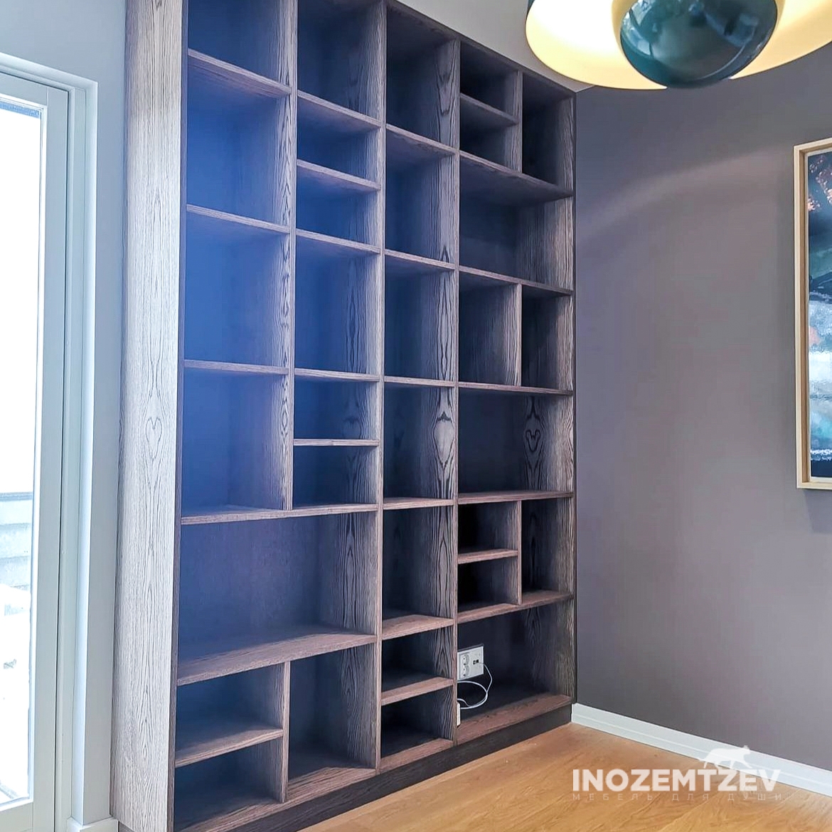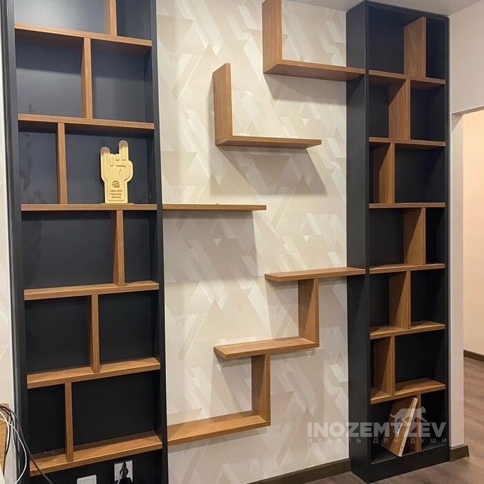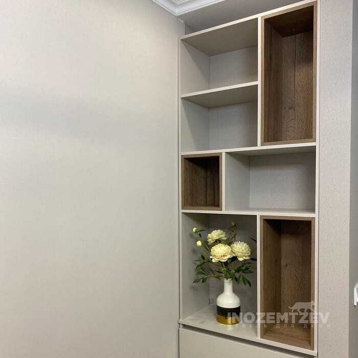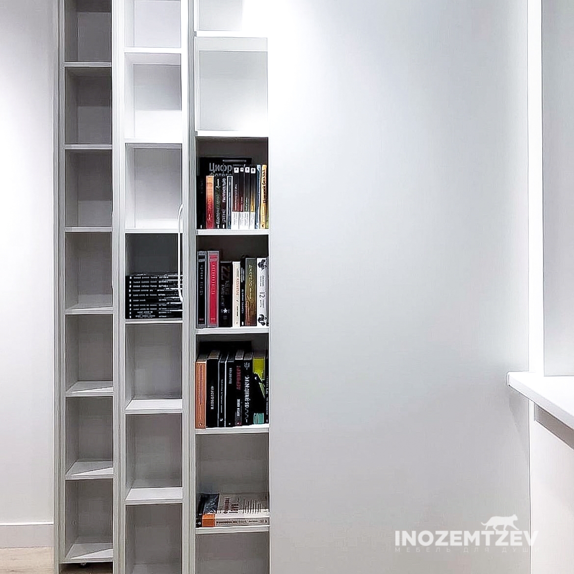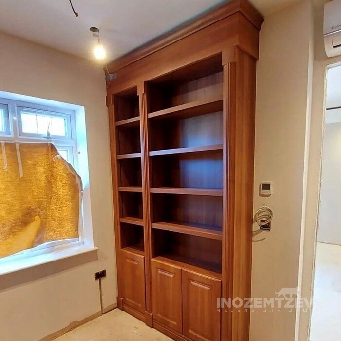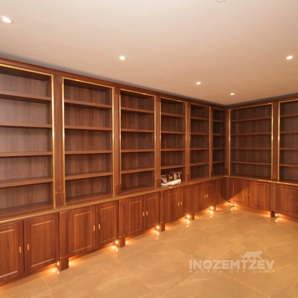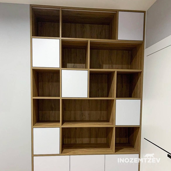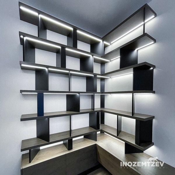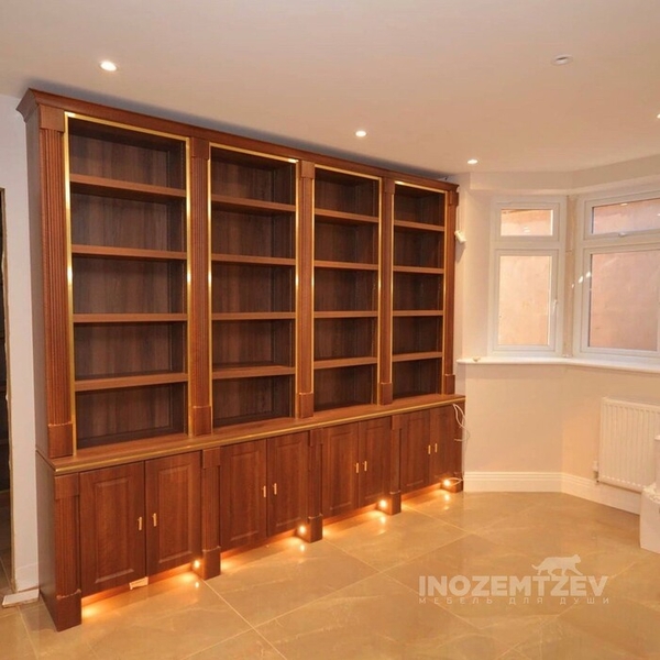 Книжный шкаф с подсветкой с открытыми и закрытыми полками в гостиную и шкаф в нишу с большой открытой полкой