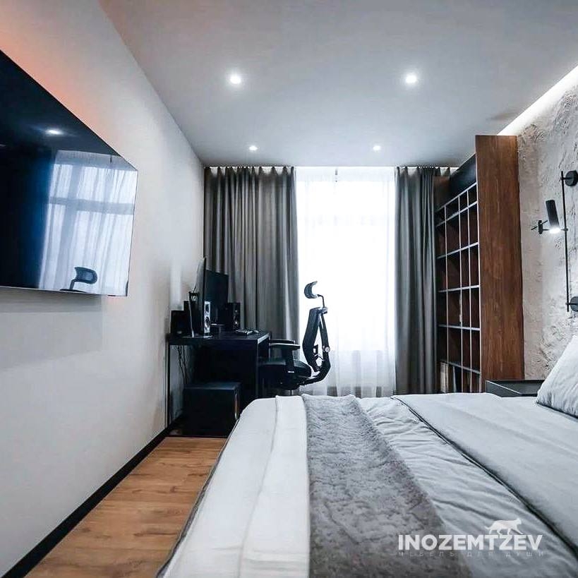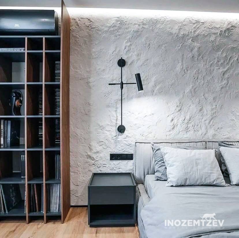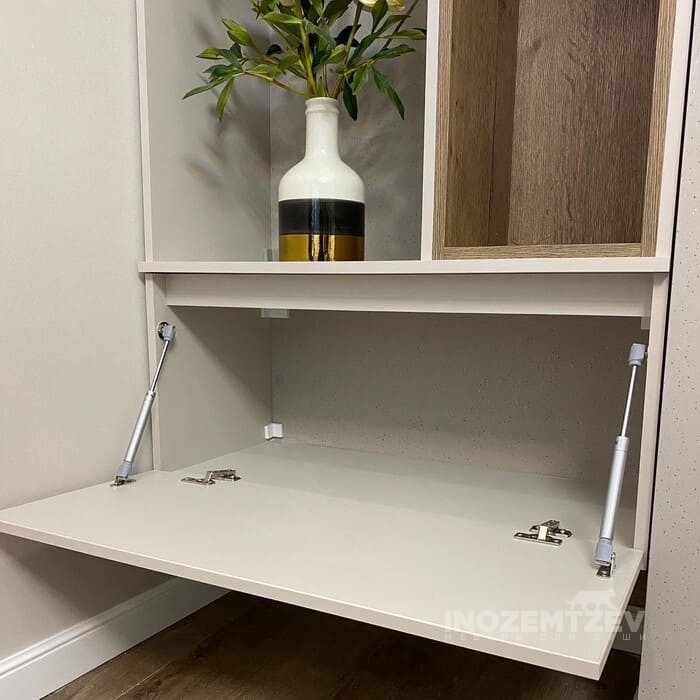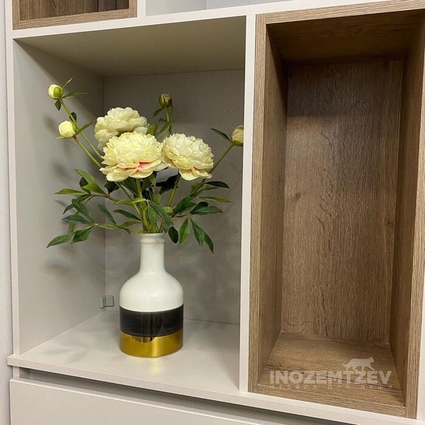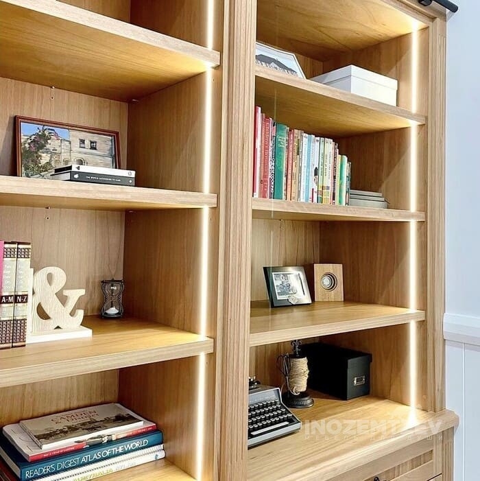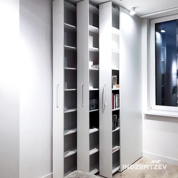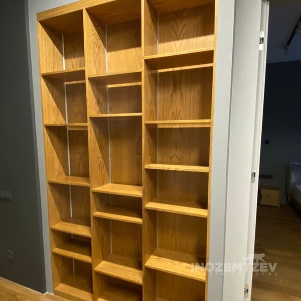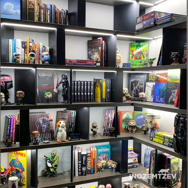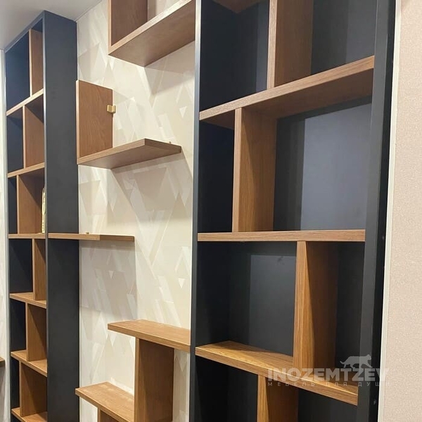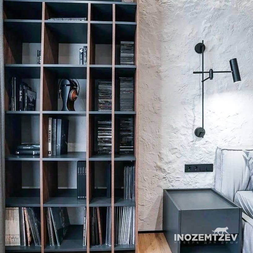 Книжный шкаф с подсветкой с открытыми и закрытыми полками в гостиную и шкаф в нишу с большой открытой полкой