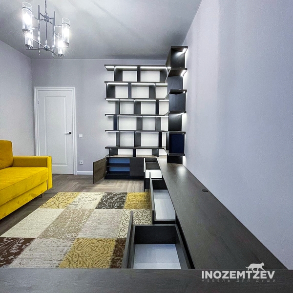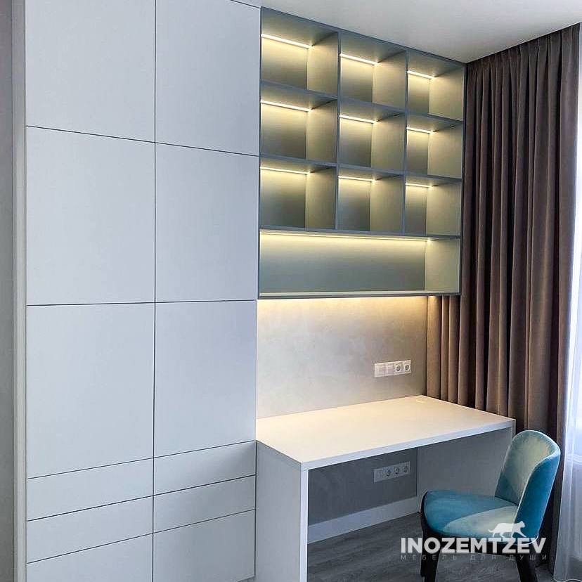 Шкаф с открытыми полками с подсветкой для книг и письменный стол с надстройкой