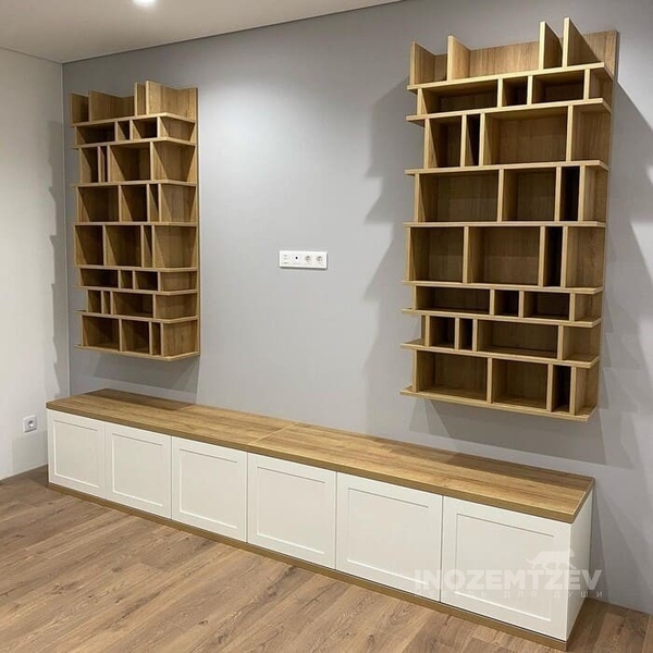 Стильный стеллаж для книг с длинной тумбой, подвесными ящичком и полками