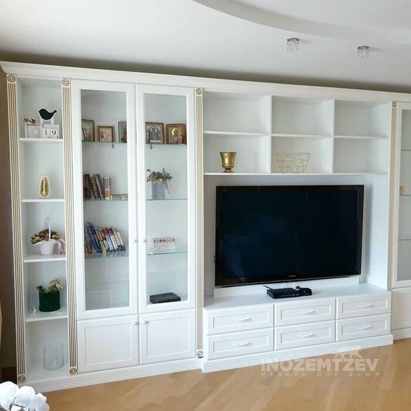Комплекс мебели в гостиную в современном стиле: открытые полки с подсветкой для книг и угловая длинная тумба под телевизор с выдвижными ящиками