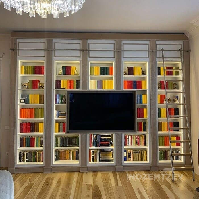 Большой книжный шкаф с нишей под телевизор, подсветкой внутри шкафа и мобильной лестницей для удобства
