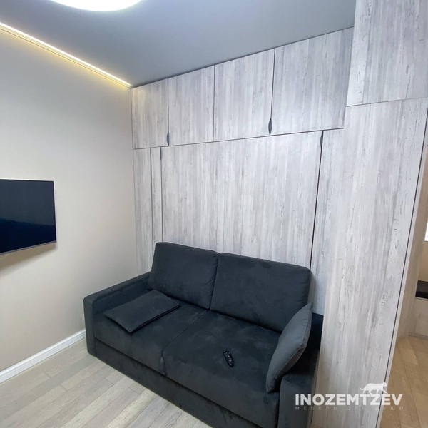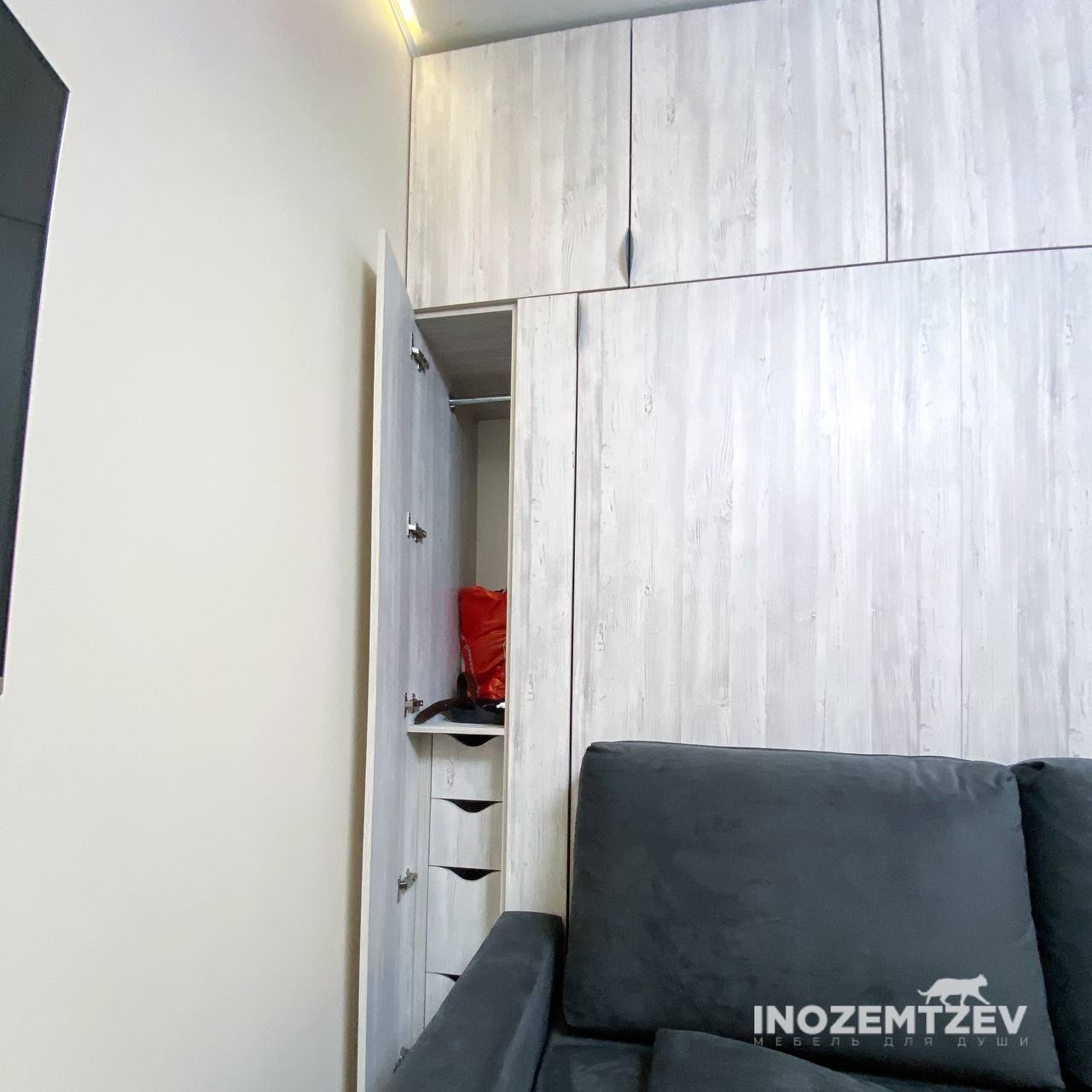 Шкаф в комнату со встроенной кроватью трансформер из ЛДСП Egger Сосна Касцина, фурнитура с доводчиком, диван, мягкая сидушка, зеркало с полировкой краев