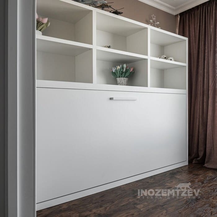 Откидная кровать трансформер в белом цвете с открытыми полками для книг и сувениров