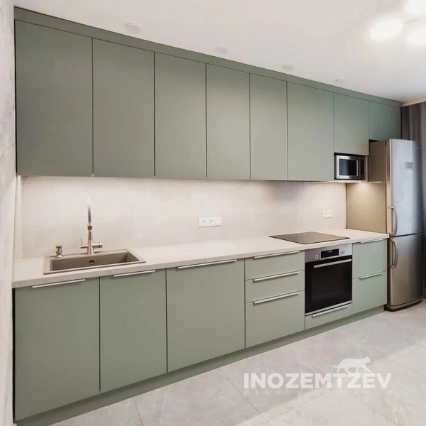 Современная зелёная кухня по ул. Авиаторов. Выполнена из ЛДСП Egger. Гладкие, матовые поверхности без лишних деталей