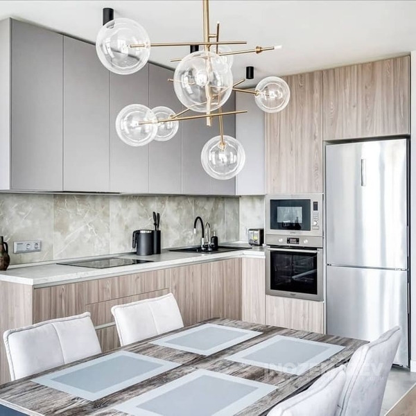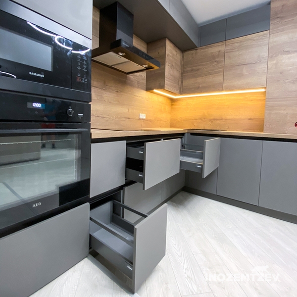 Кухня из ЛДСП. Верхние и нижние ярусы - ЛДСП Egger Кашемир серый. Средний ярус - ЛДСП Egger Дуб Галифакс натуральный. Фурнитура с доводчиком и подсветка.