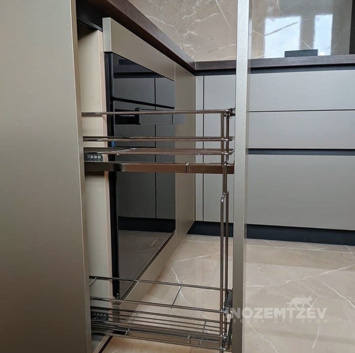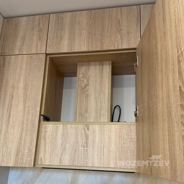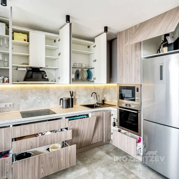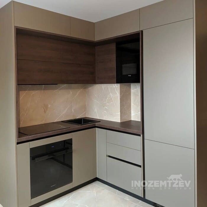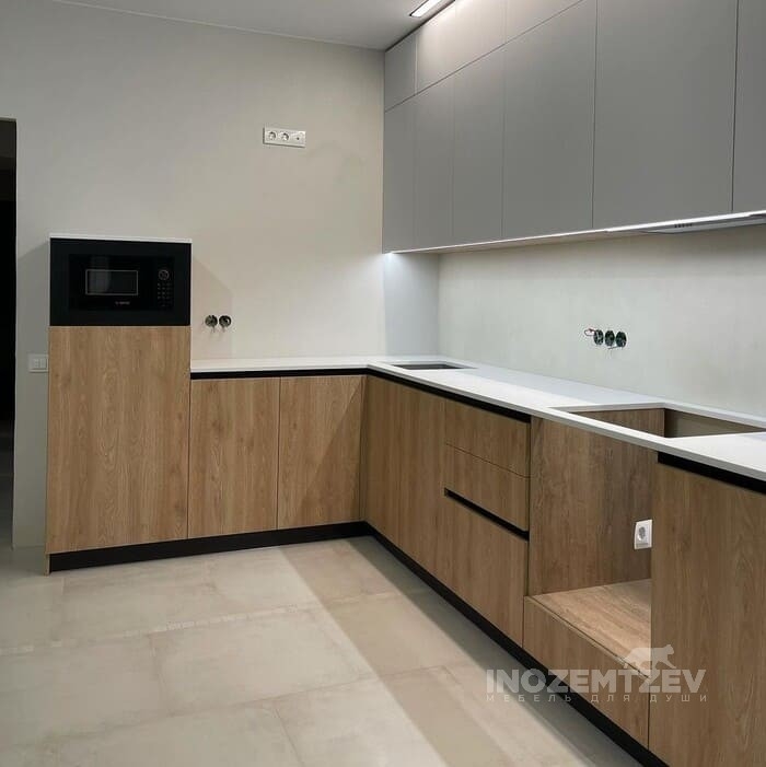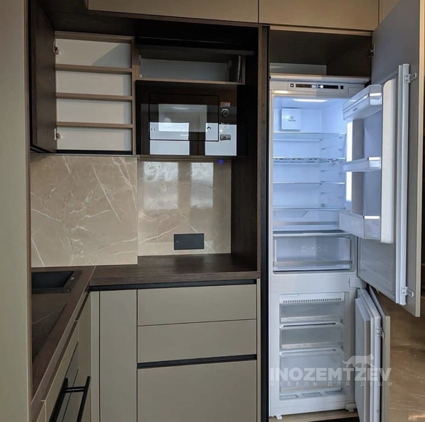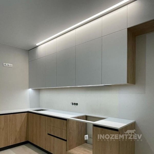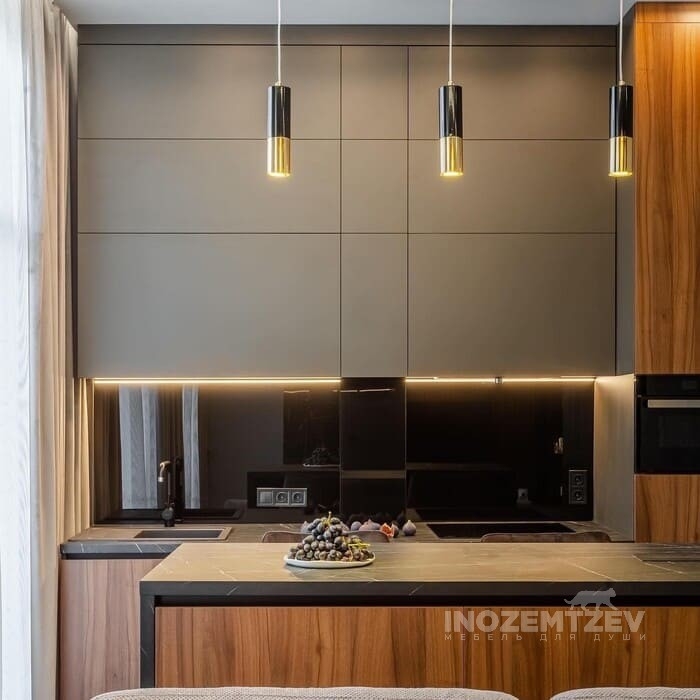 Встроенная кухня на заказ. Фасадная часть нижнего и верхнего яруса: МДФ AGT Supramat 3022. Фасадная часть среднего яруса: ЛДСП Egger Дуб Галифакс табак. Фурнитур Blum и подсветка.