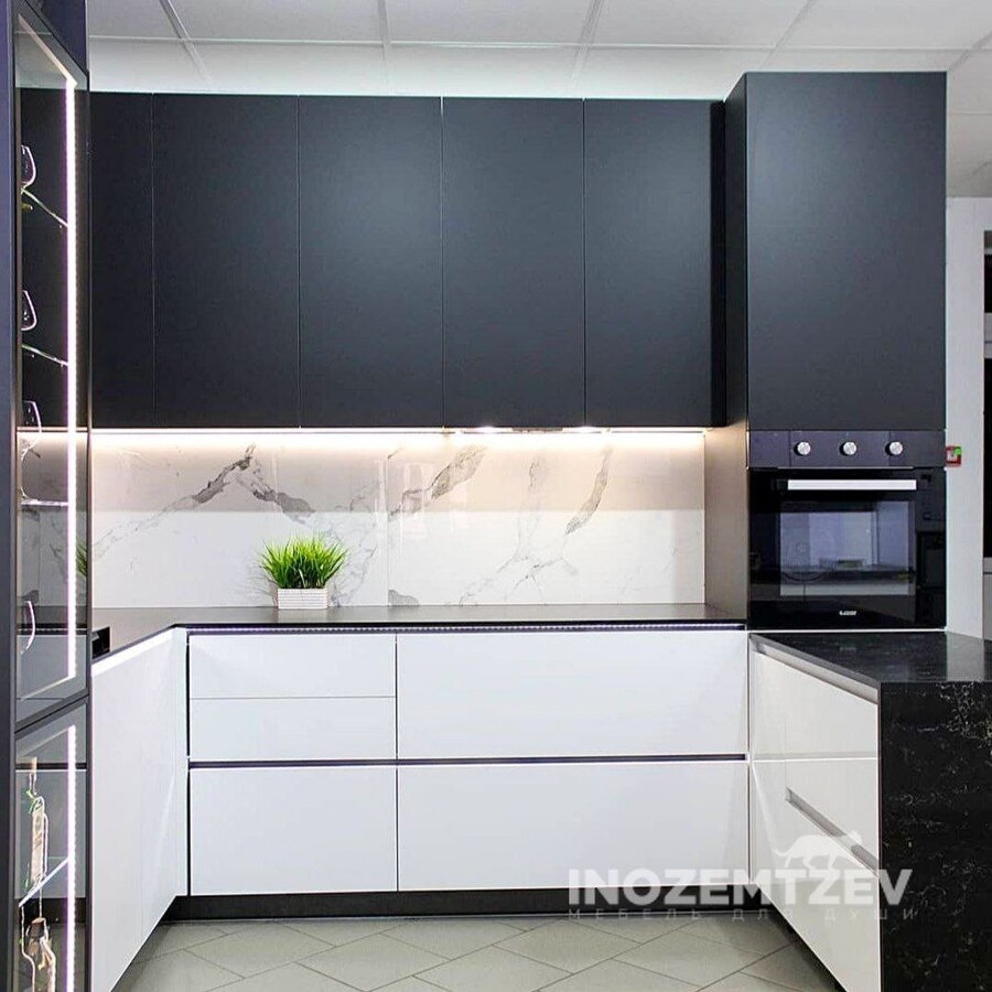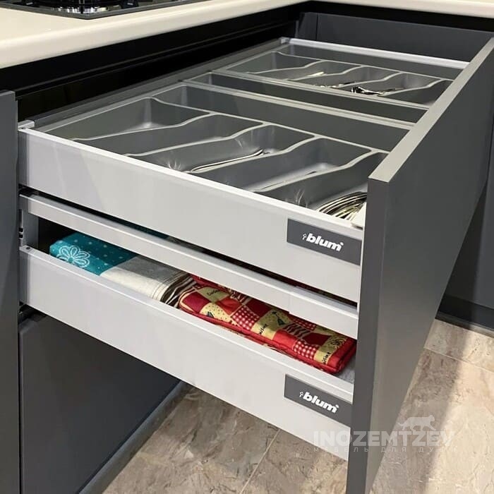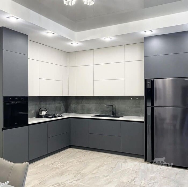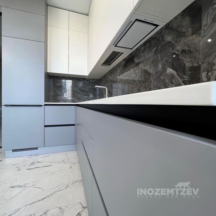 Кухняиз ЛДСП в комбинации темно серого и белого цветов, фурнитура Blum