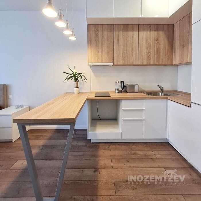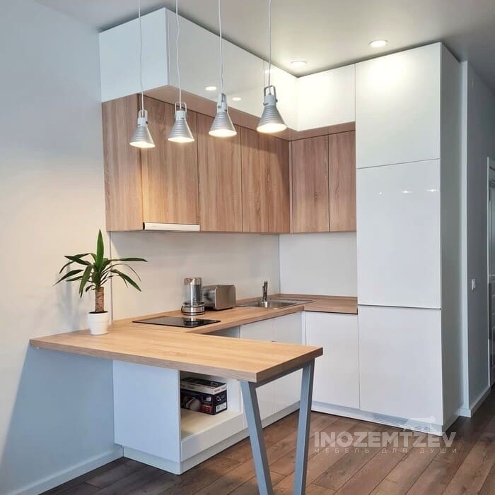 Кухня с барной стойкой из ЛДСП в сочетании нескольких цветов: текстурного и фонового
