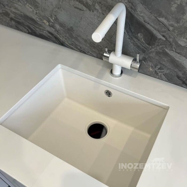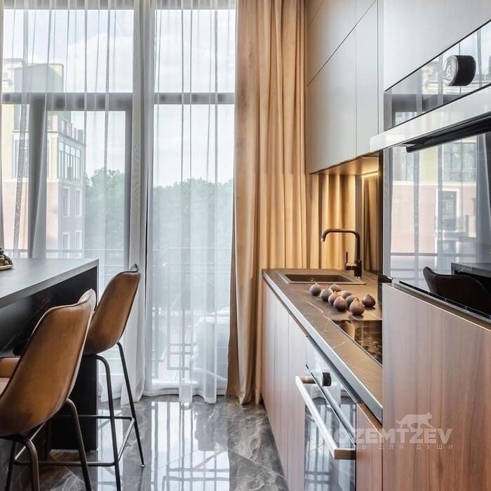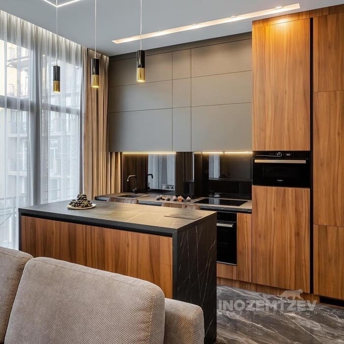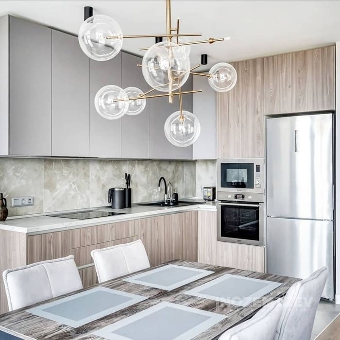 Мягкая LED-подсветка под верхними шкафами подчеркивает красоту мрамора и добавляет уюта рабочей зоне