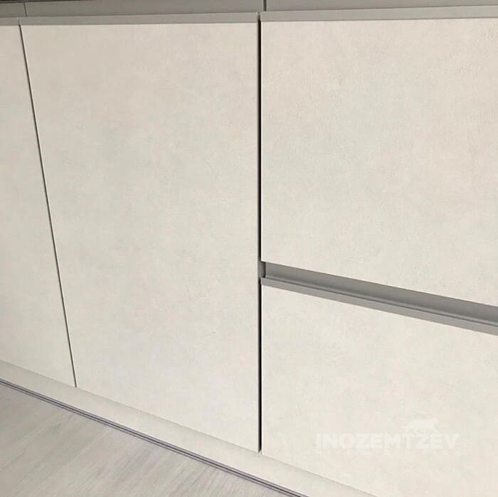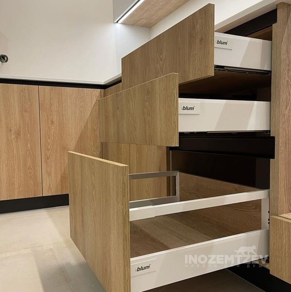 Кухня из текстурного ЛДСП и однотонного МДФ с фурнитурой Blum