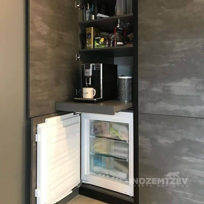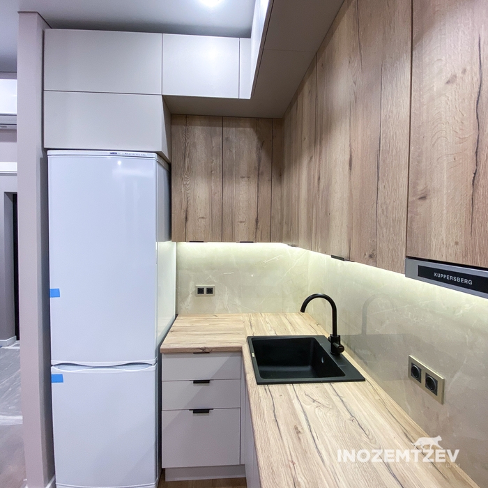 Маленькая кухня из ЛДСП со встроенным холодильником и бутылочницей
