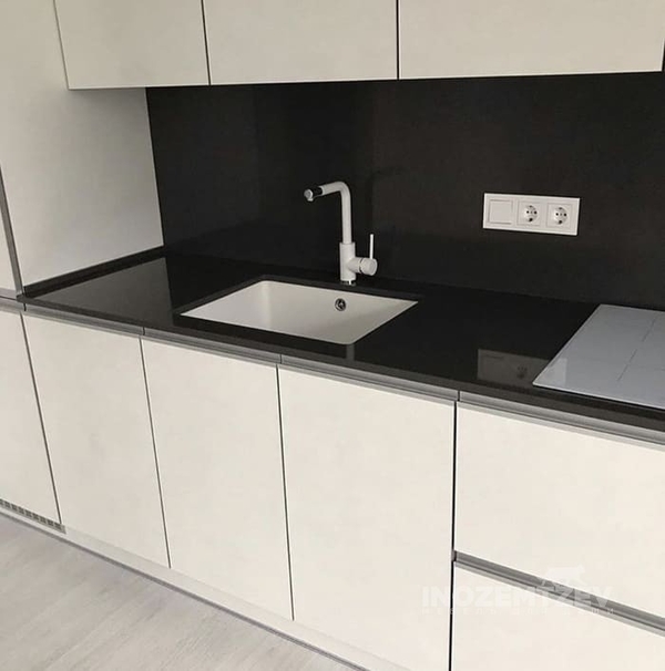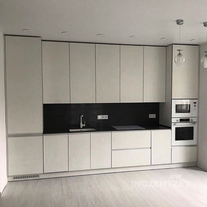 Прямая кухня из ЛДСП Egger с гладкими фасадами фонового цвета и темной акриловой столешницей