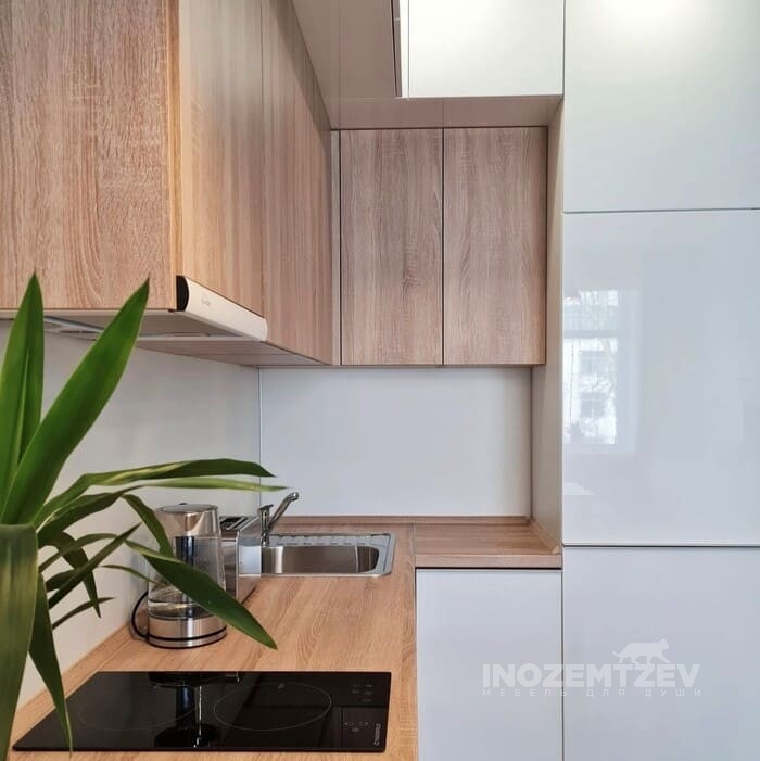 Маленькая угловая кухня с обеденным столом в студию из текстурного ЛДСП и глянцевого МДФ
