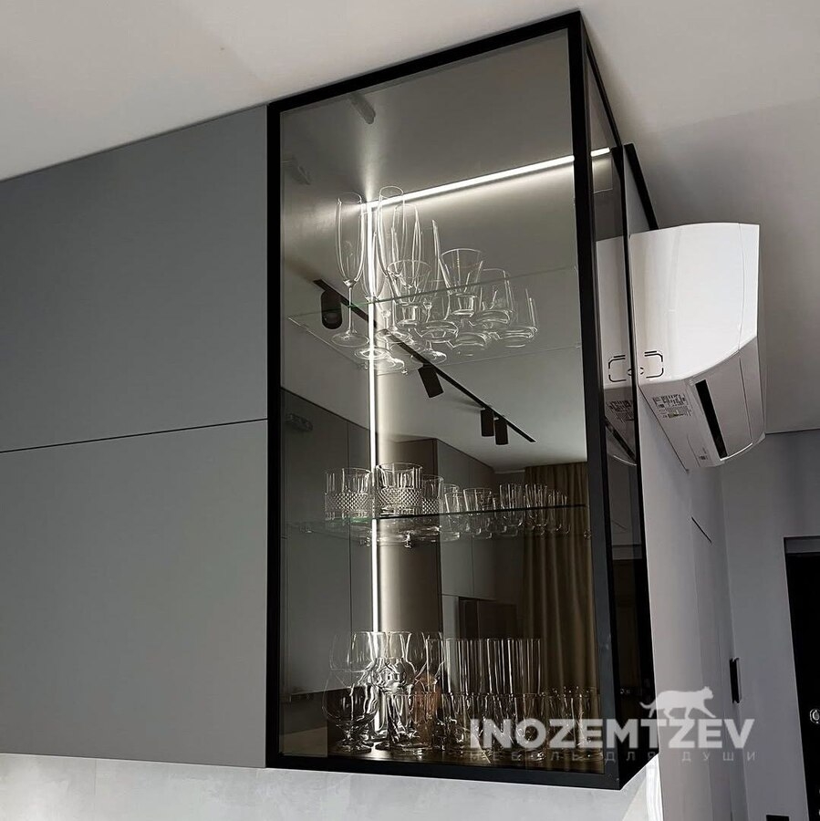 Кухня в сером цвете по ул. Тверской. Столешница под светлое дерево. Угловой застекленный шкаф-витрина с черной рамой и внутренней подсветкой