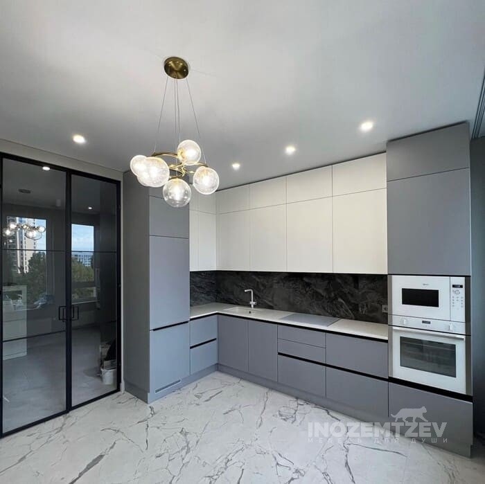 Прямая современная кухня по ул. Тверская. Белые верхние шкафы создают ощущение лёгкости и простора, а нижние шкафы серого оттенка придают интерьеру солидность и выразительность