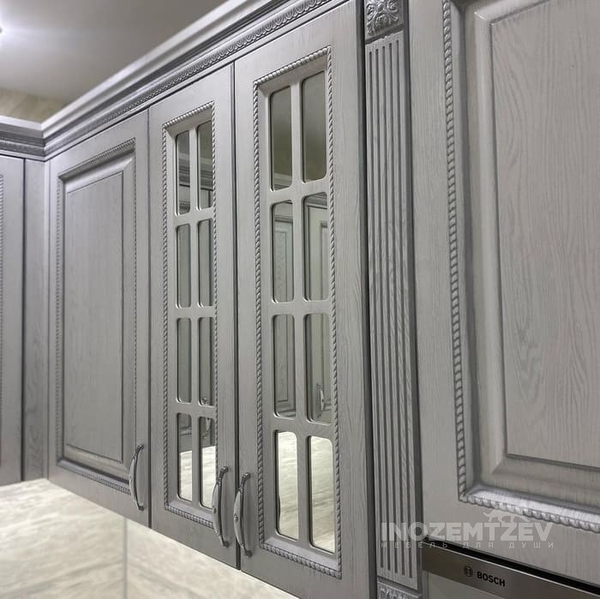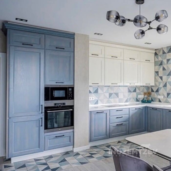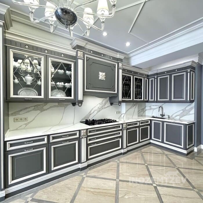 Кухня из массива ольхи в двух цветовых решениях с декоративными элементами, выполненная в классическом стиле