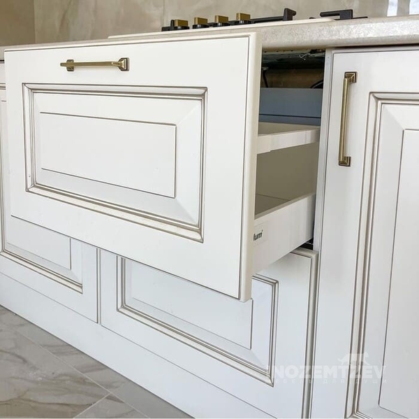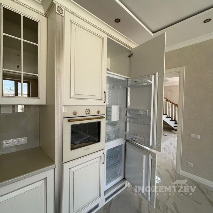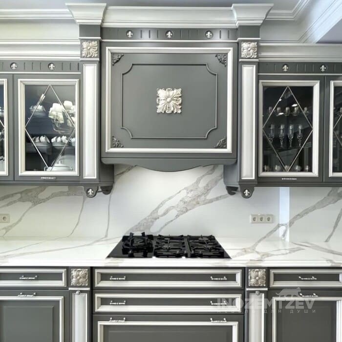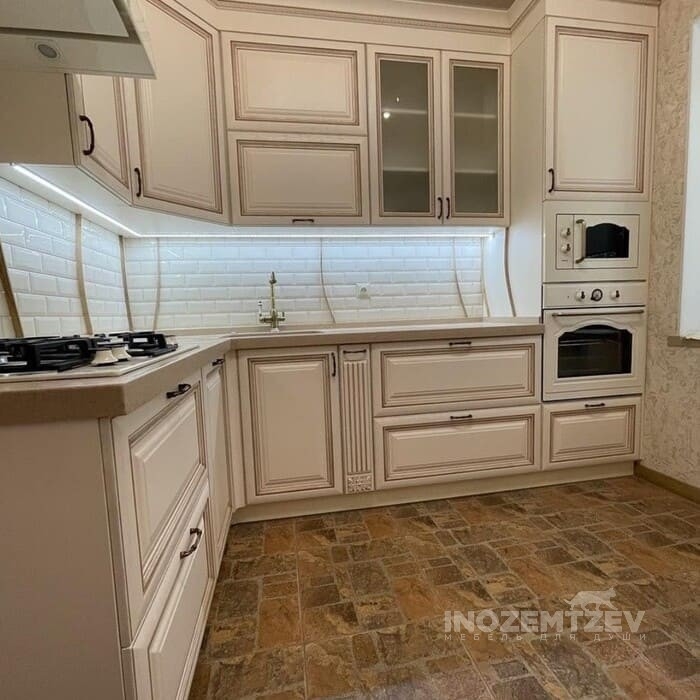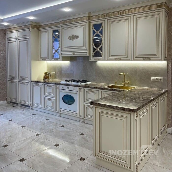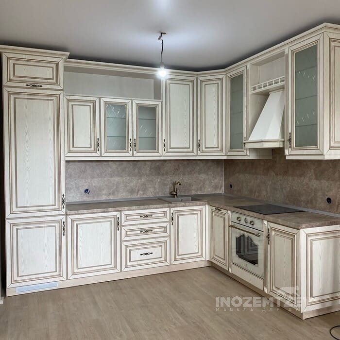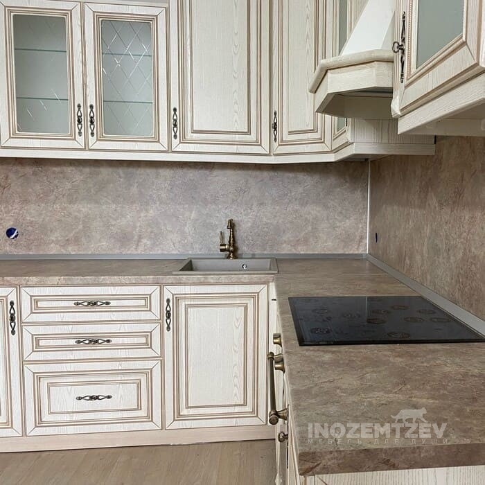 Кухня из массива ясеня с патиной шампань со столешницей из акрилового камня в классическом стиле