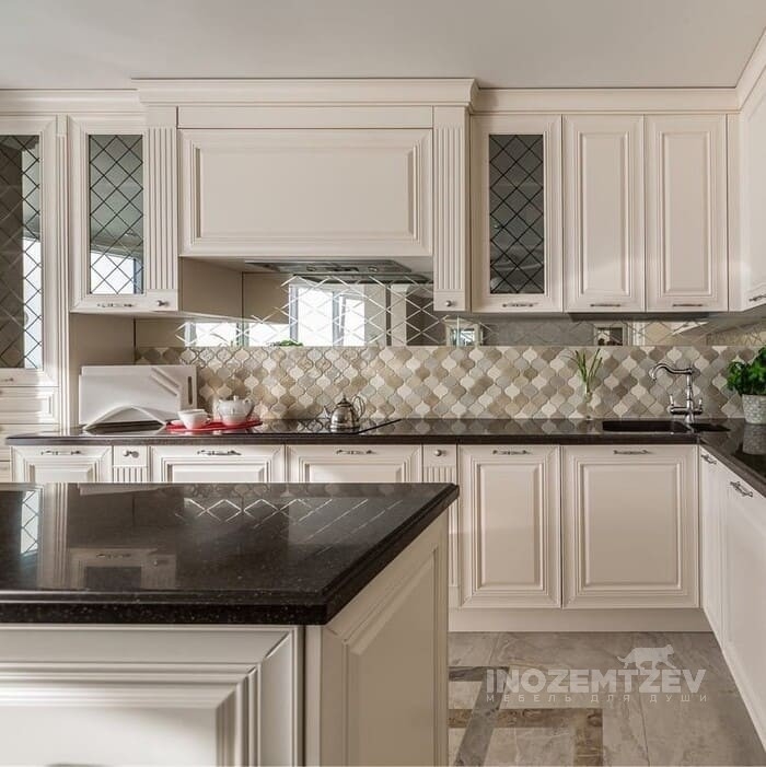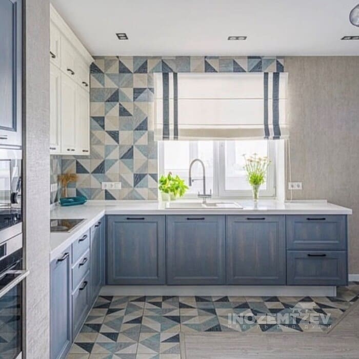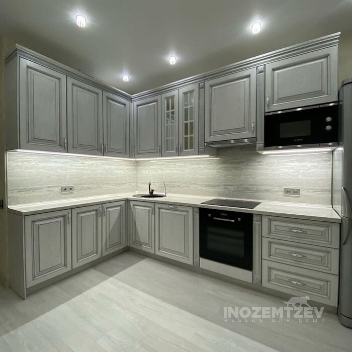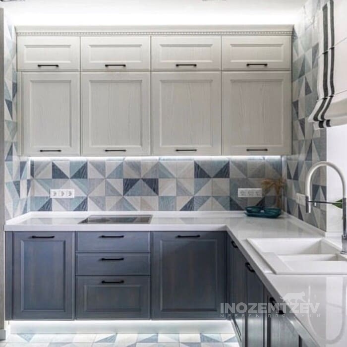 Небольшая угловая кухня с фасадами с филенкой и стеклом