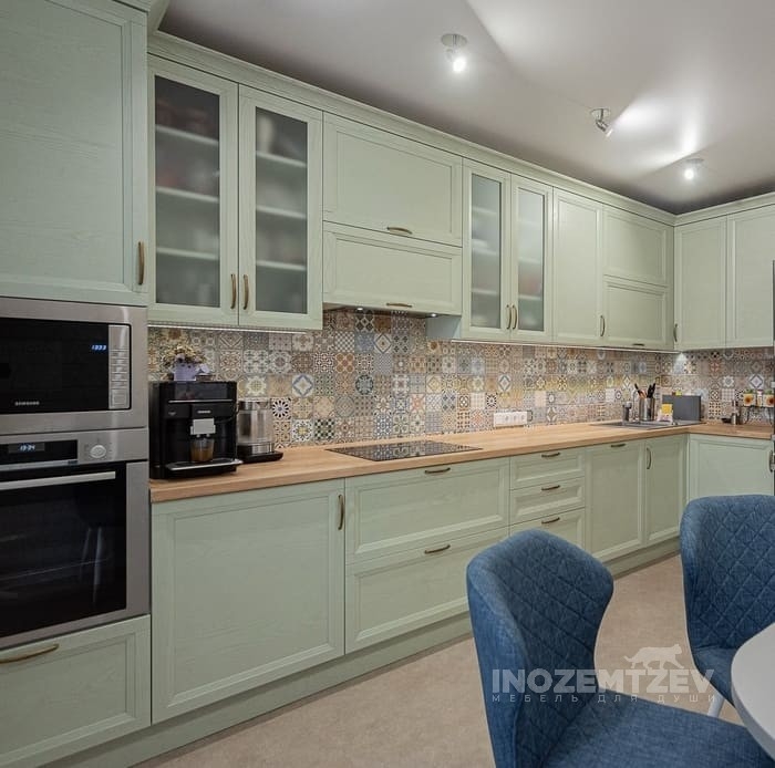 Уютная кухня из массива дерева со встроенной техникой и карнизом по периметру