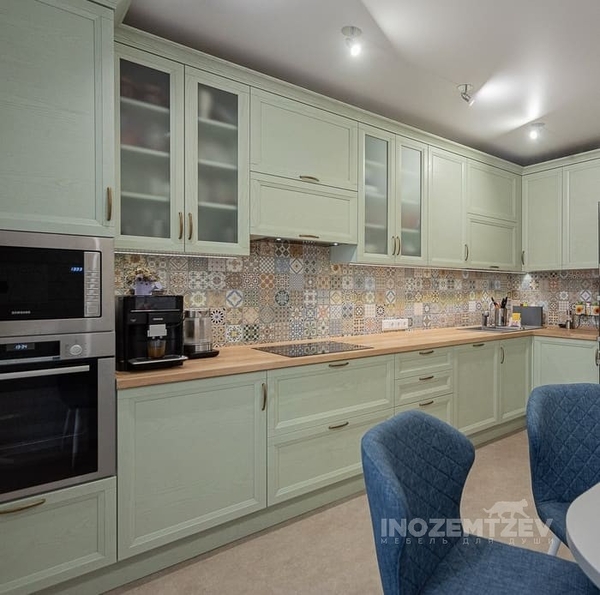 Угловая кухня из массива дуба с глянцевой столешницей и фартуком, с фурнитурой Blum