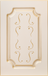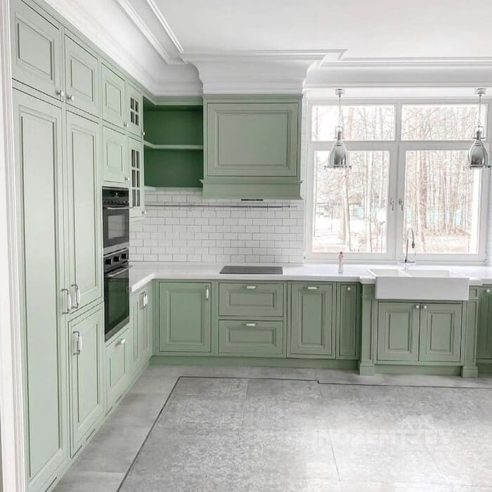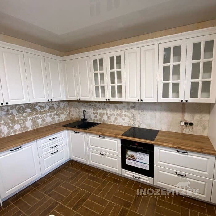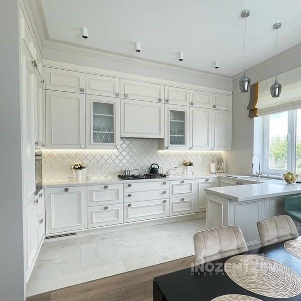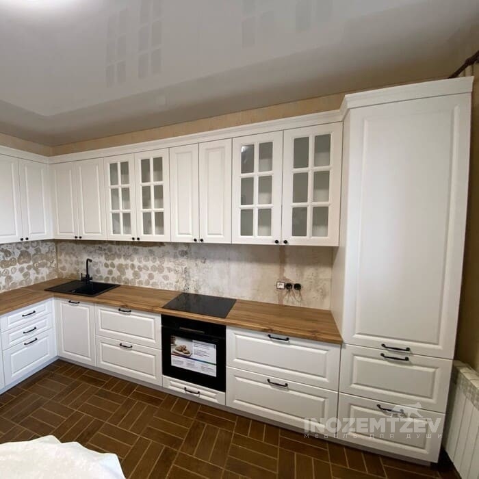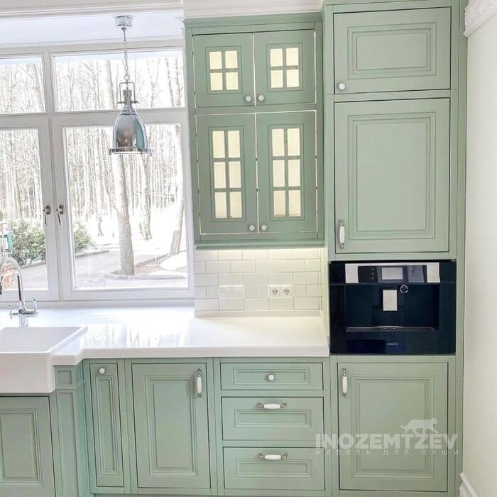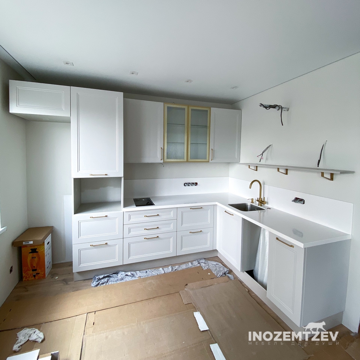 Кухонная мебель угловая, выполненная в классическом стиле из крашенного МДФ