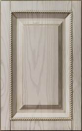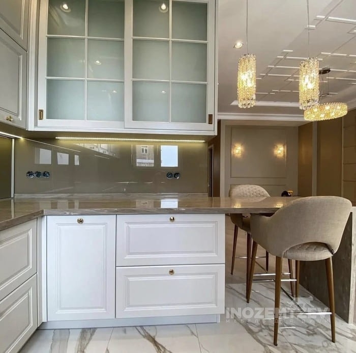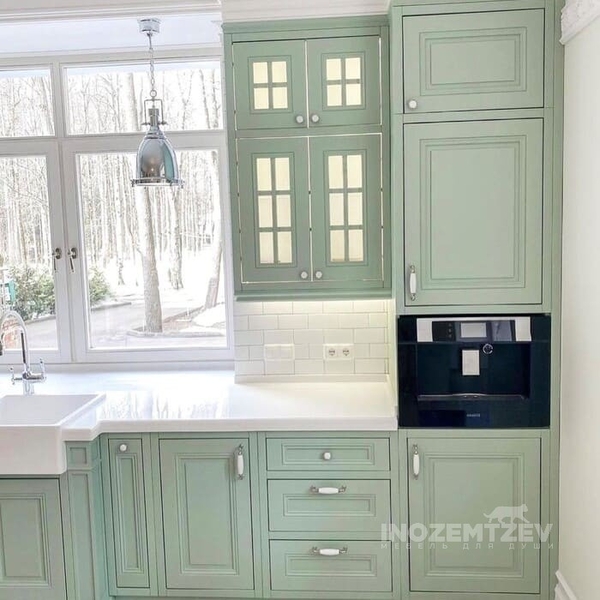 Нежная кухня в частный дом с фасадами из МДФ эмали и витринами
