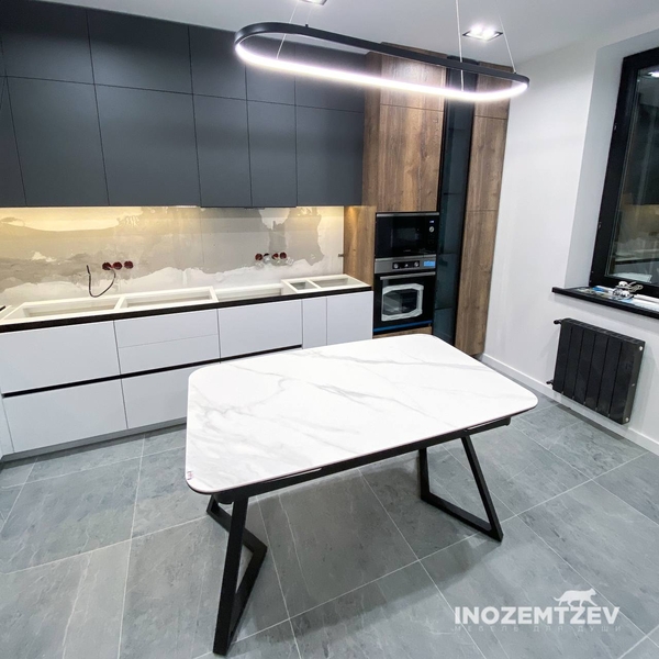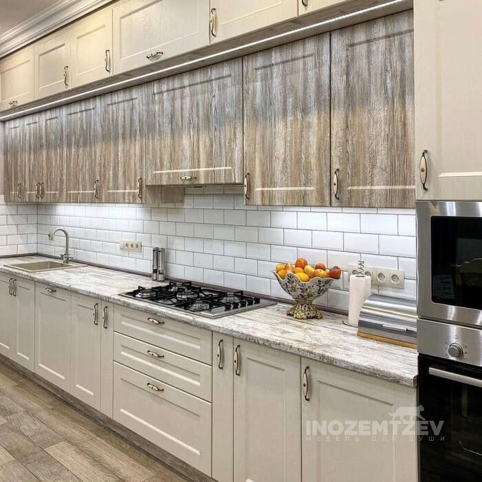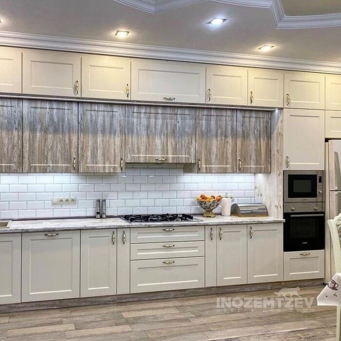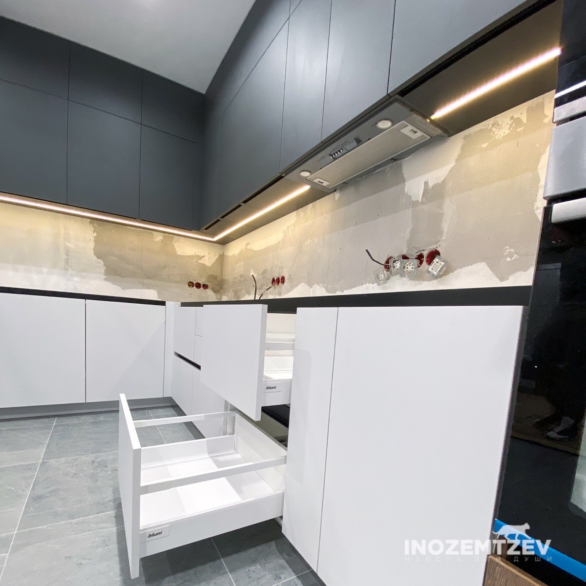 Современная кухня из комбинации нескольких цветов МДФ AGT и ЛДСП Egger Дуб Галифакс олово, фурнитура Blum, подсветка 4000k, сушка для посуды, бутылочницы