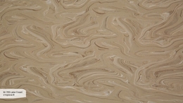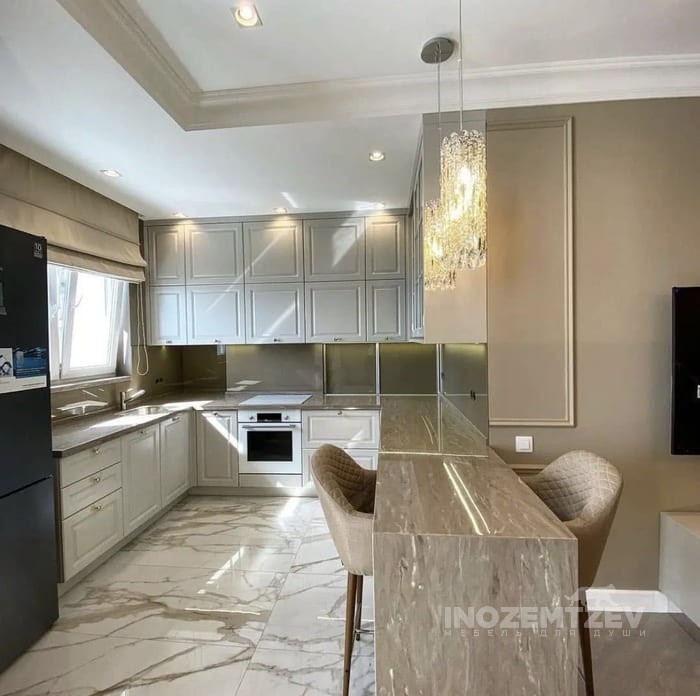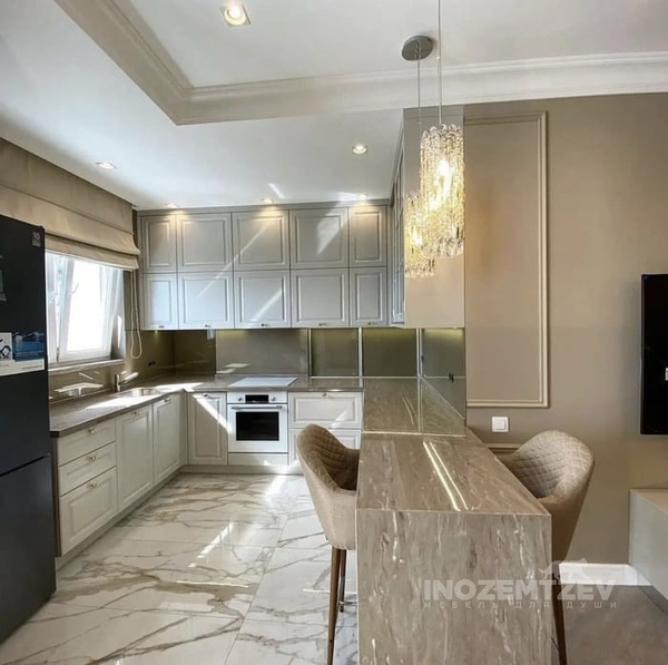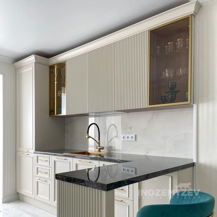 Бежевая кухня из МДФ эмали с латуниевой фурнитурой и барной стойкой