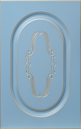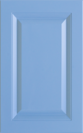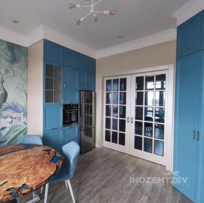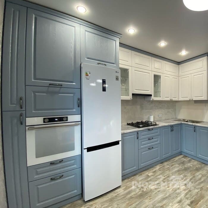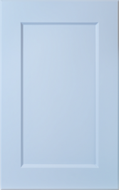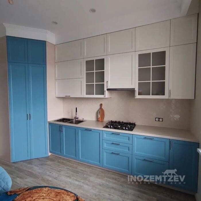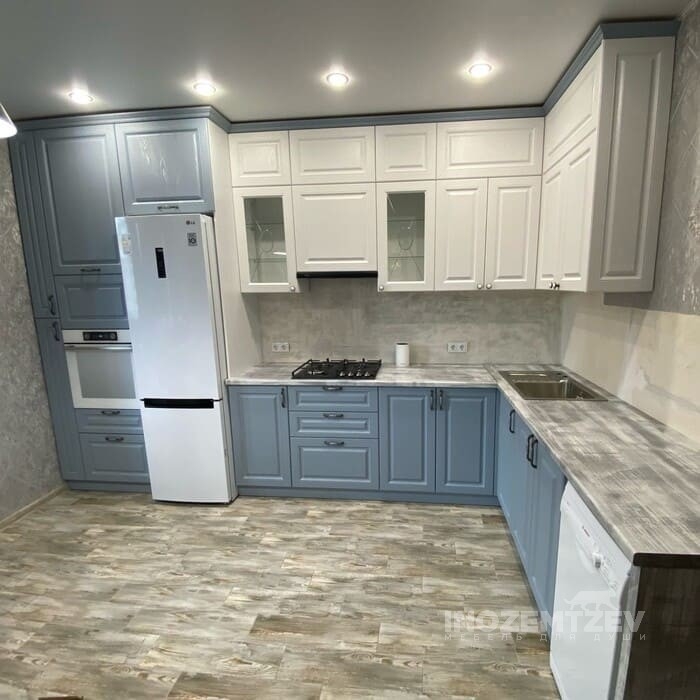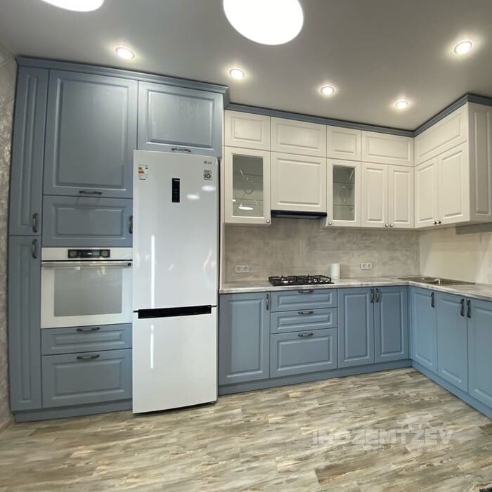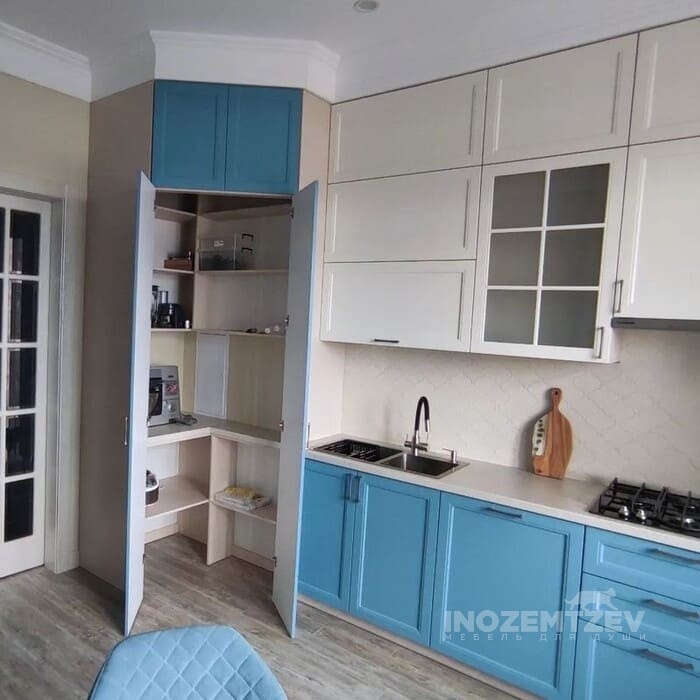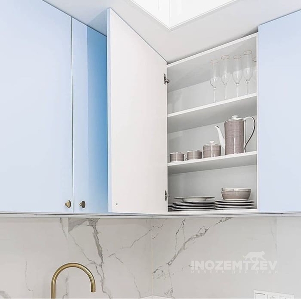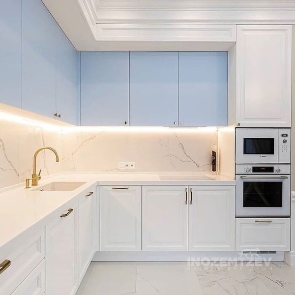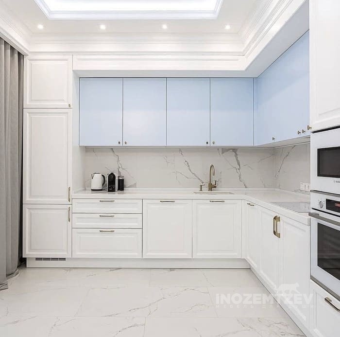 Кухня с матовыми МДФ фасадами в нежно голубом и белом цветовом исполнении