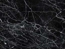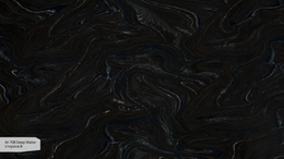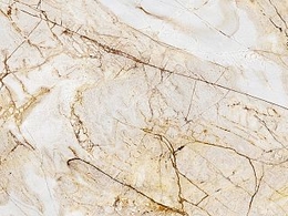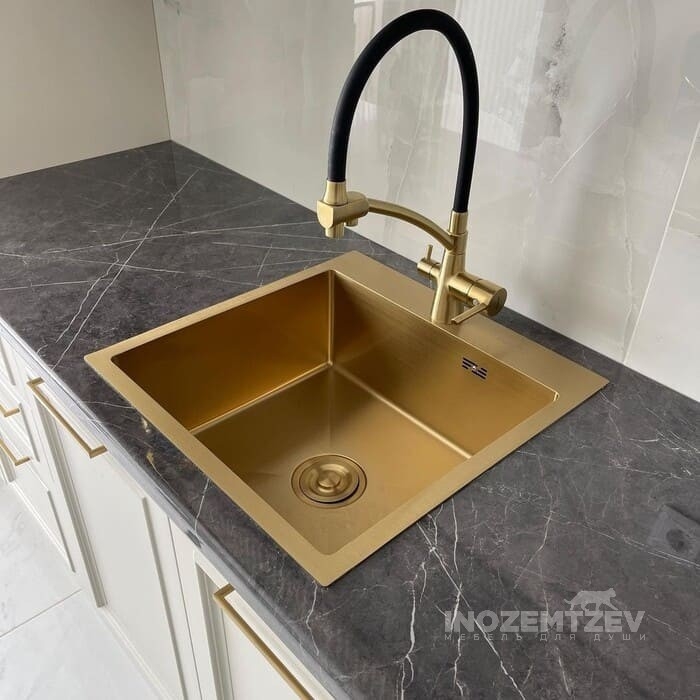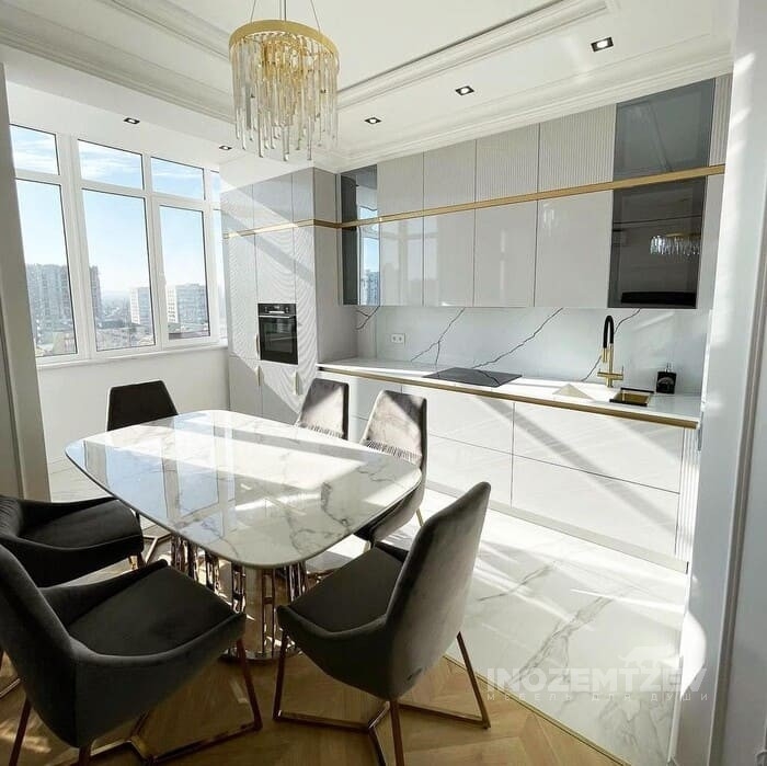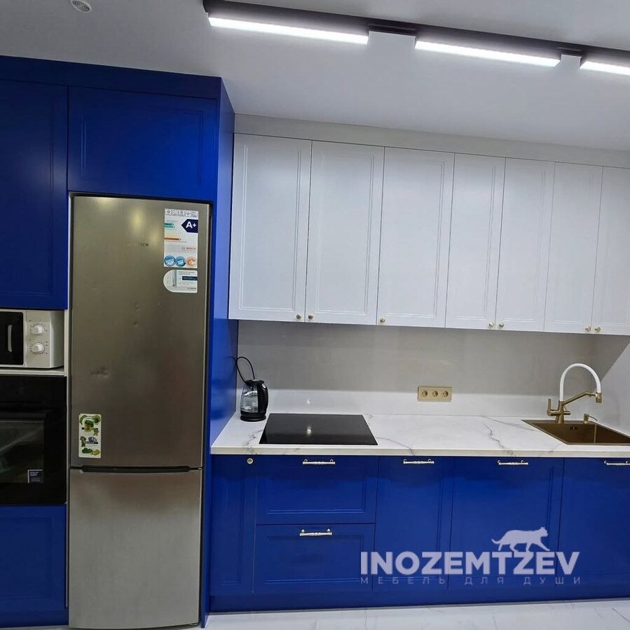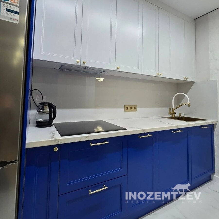 Сочетание синего и белого в кухонном гарнитуре с мраморной столешницей и стильными золотыми деталям