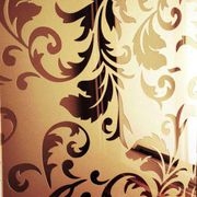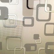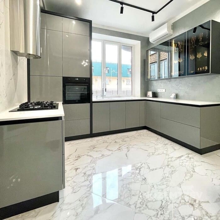 П-образная кухня в современном стиле с глянцевым покрытием и стеклянными дверцами в алюминиевом профиле