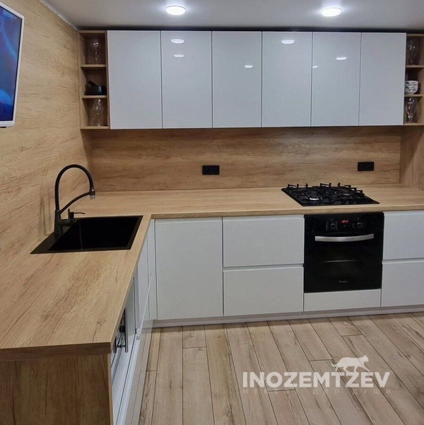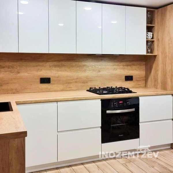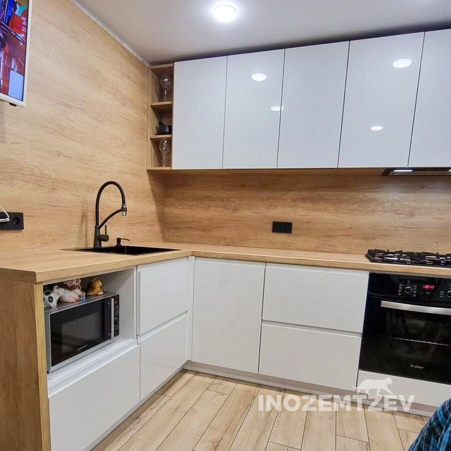 Современная угловая кухня по ул. Академика Павлова. Белый МДФ и теплая текстура дерева — классическое и беспроигрышное сочетание