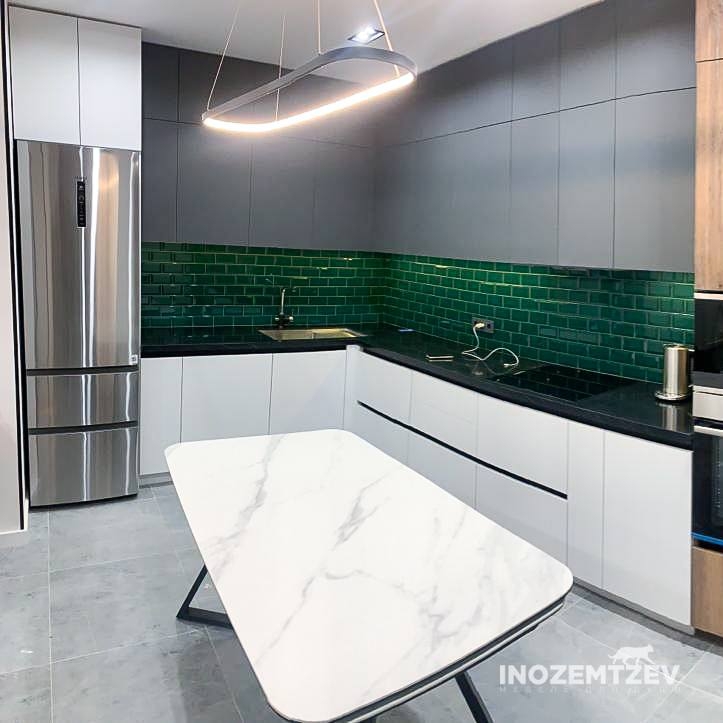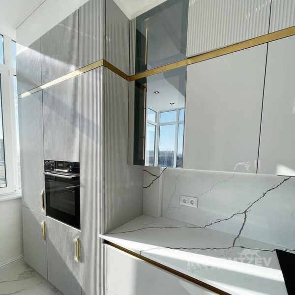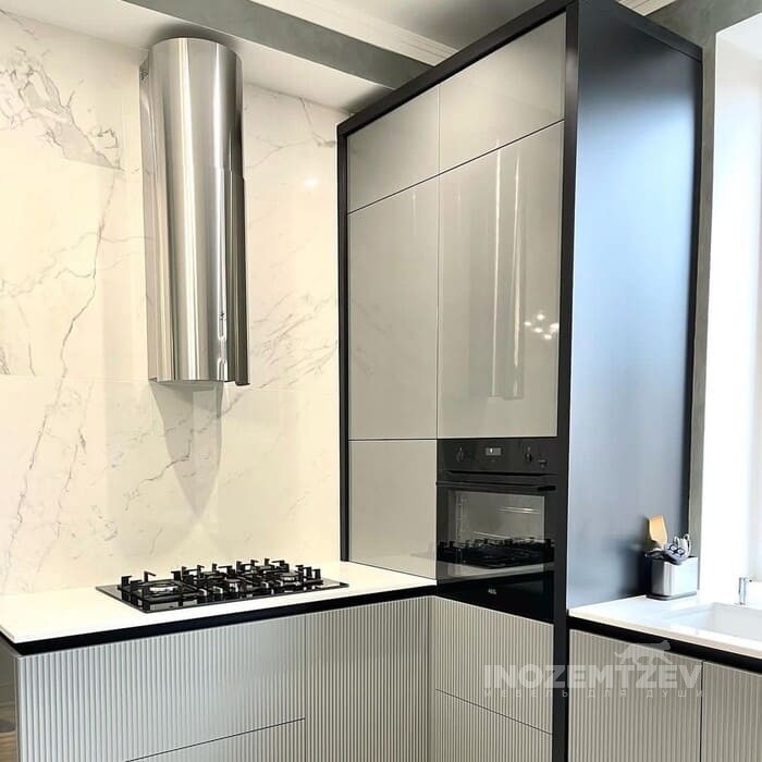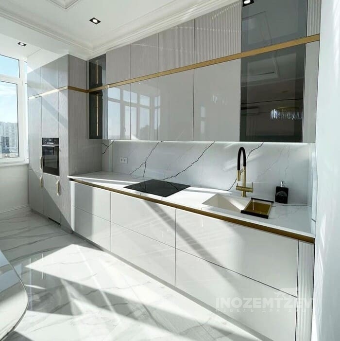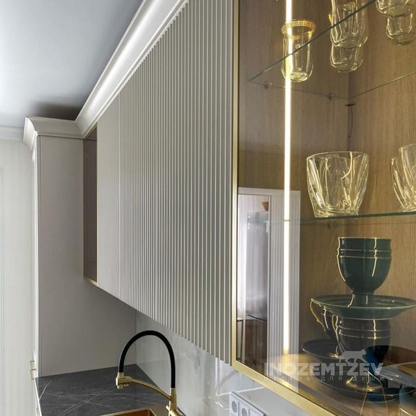 Стильная кухня из МДФ с гладкими, стеклянными и 3D фасадами