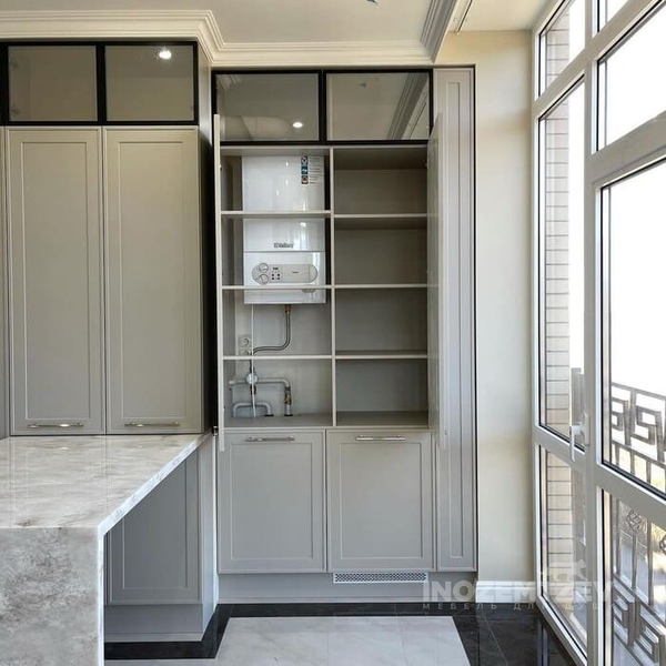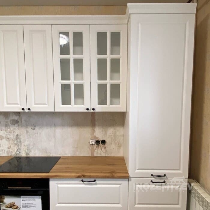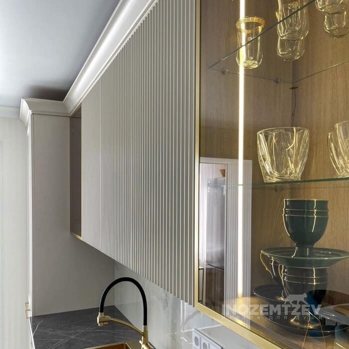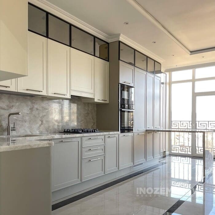 Кухня с матовыми фасадами из МДФ эмали и антресолями со стеклянными дверцами в алюминиевом профиле