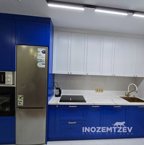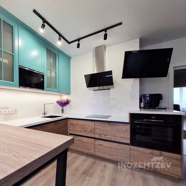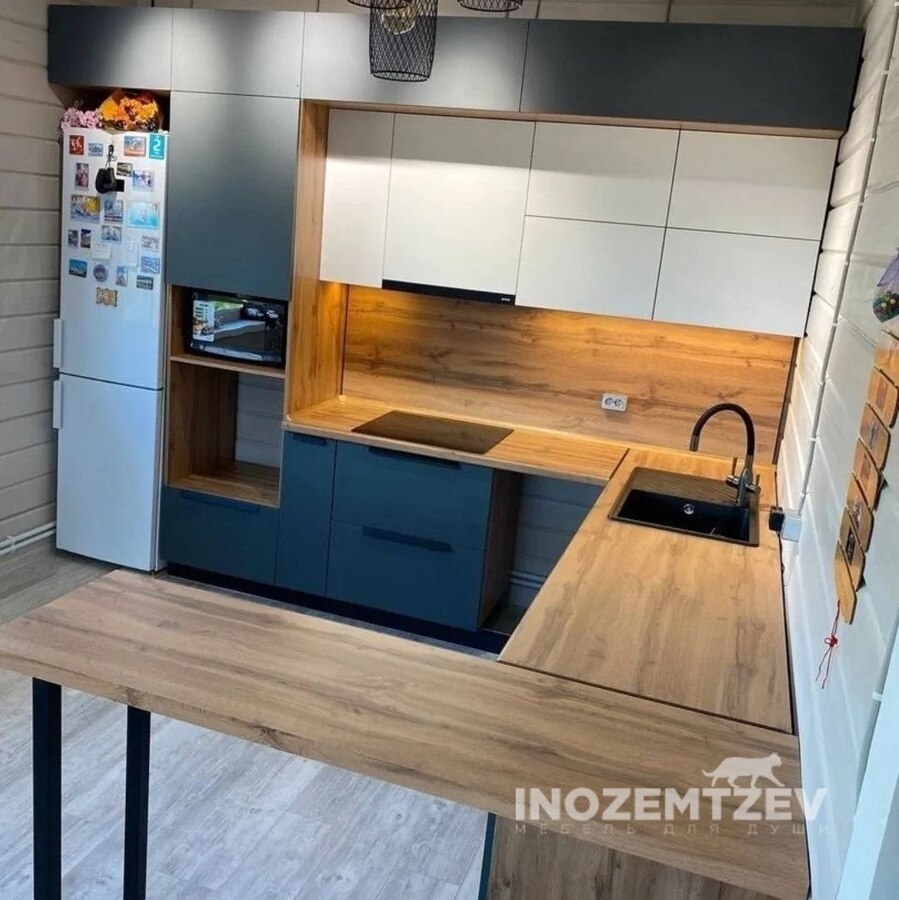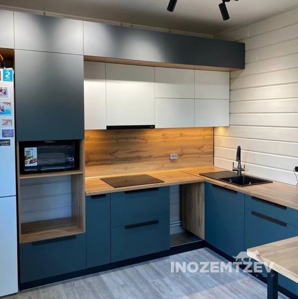 Угловая кухня в современном стиле по ул. Лобановский лес. Синий низ и светлый верх. Теплая древесная текстура столешницы и фартука