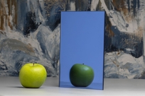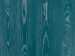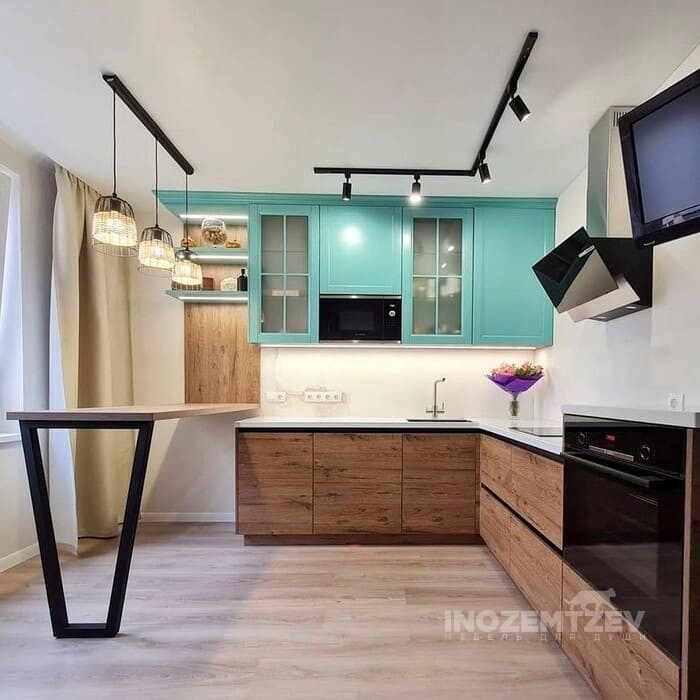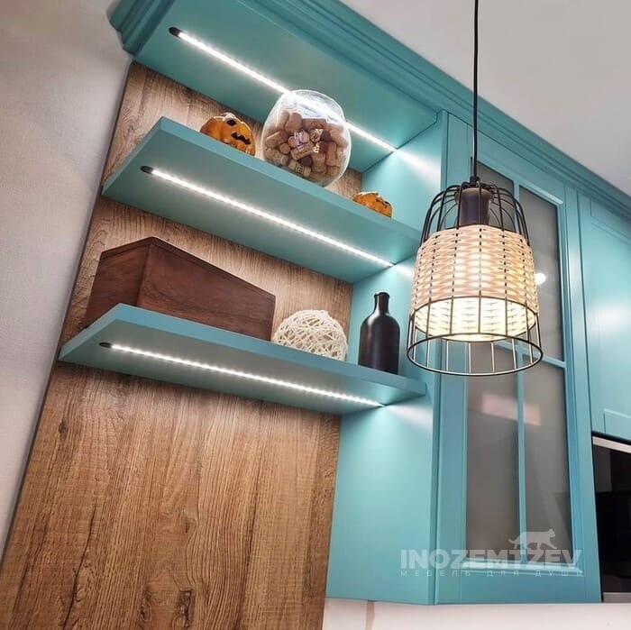 Кухня в современном стиле в бирюзовом цвете, открытые полки с подсветкой и стол на металлической ножке
