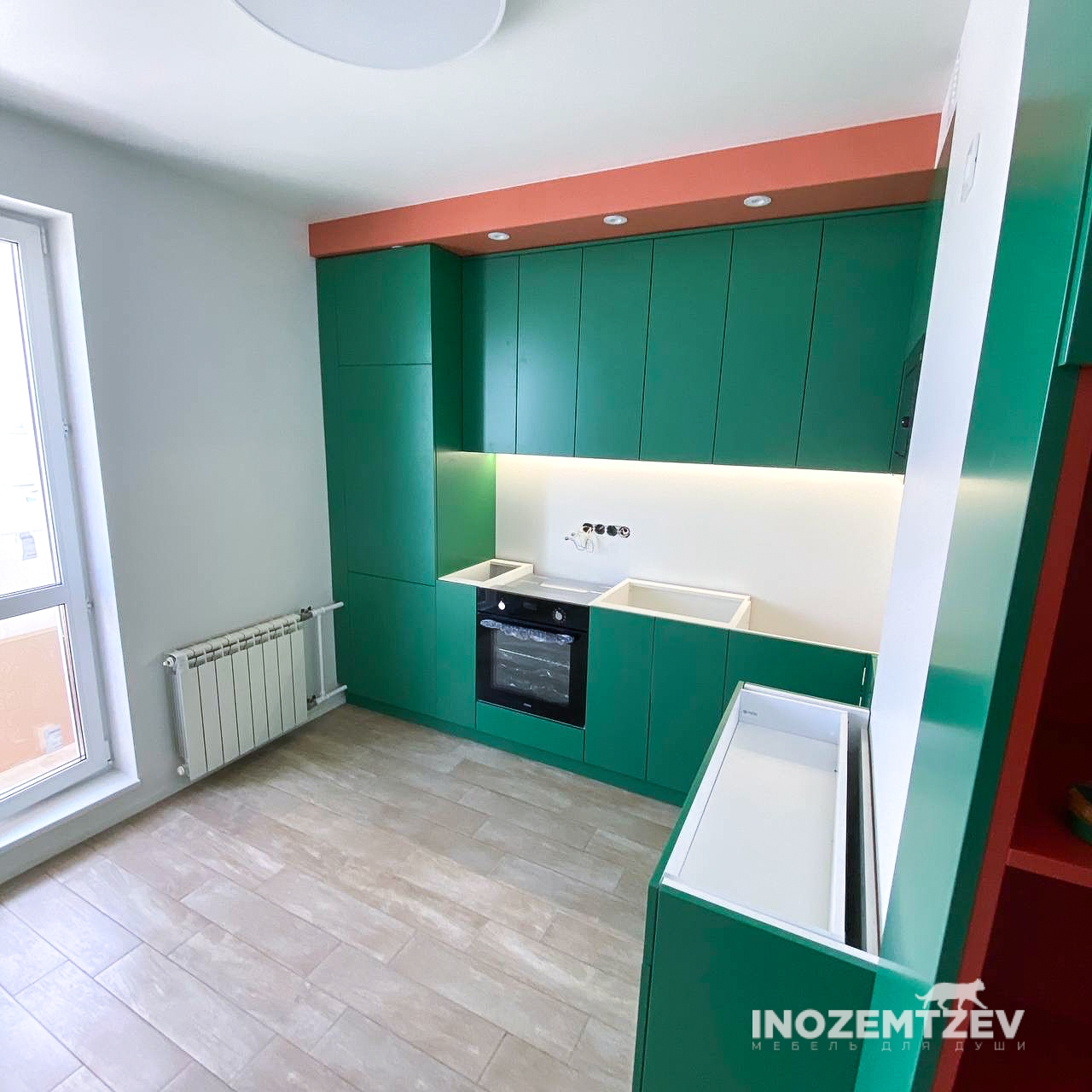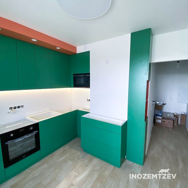 Вариант кухонного гарнитура по дизайнерскому проекту, столешница и стеновая панель далее будут устанавливаться заказчиком отдельно.