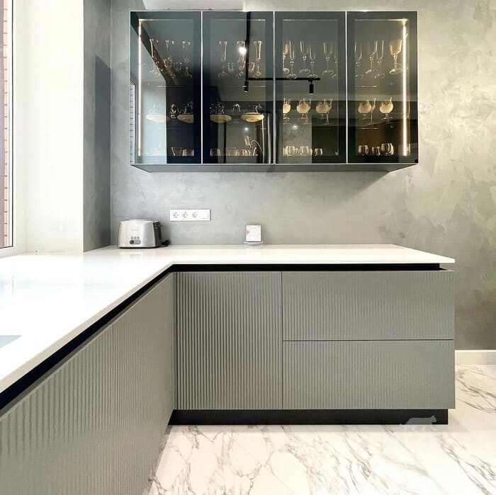 П-образная кухня с фрезерованными МДФ и стеклянными фасадами