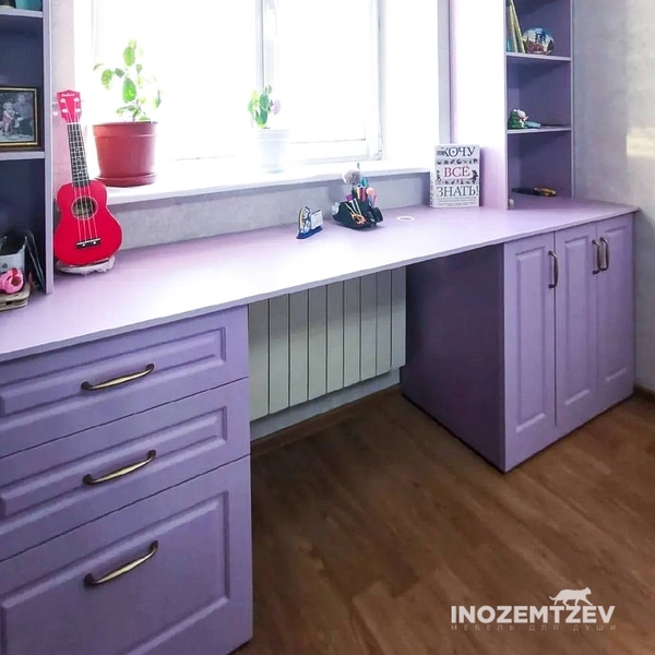 Письменный стол для школьника вдоль окна с ящиками и открытыми полками