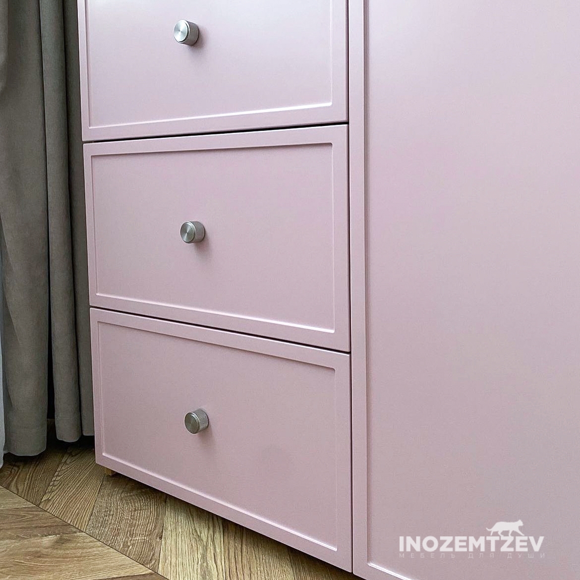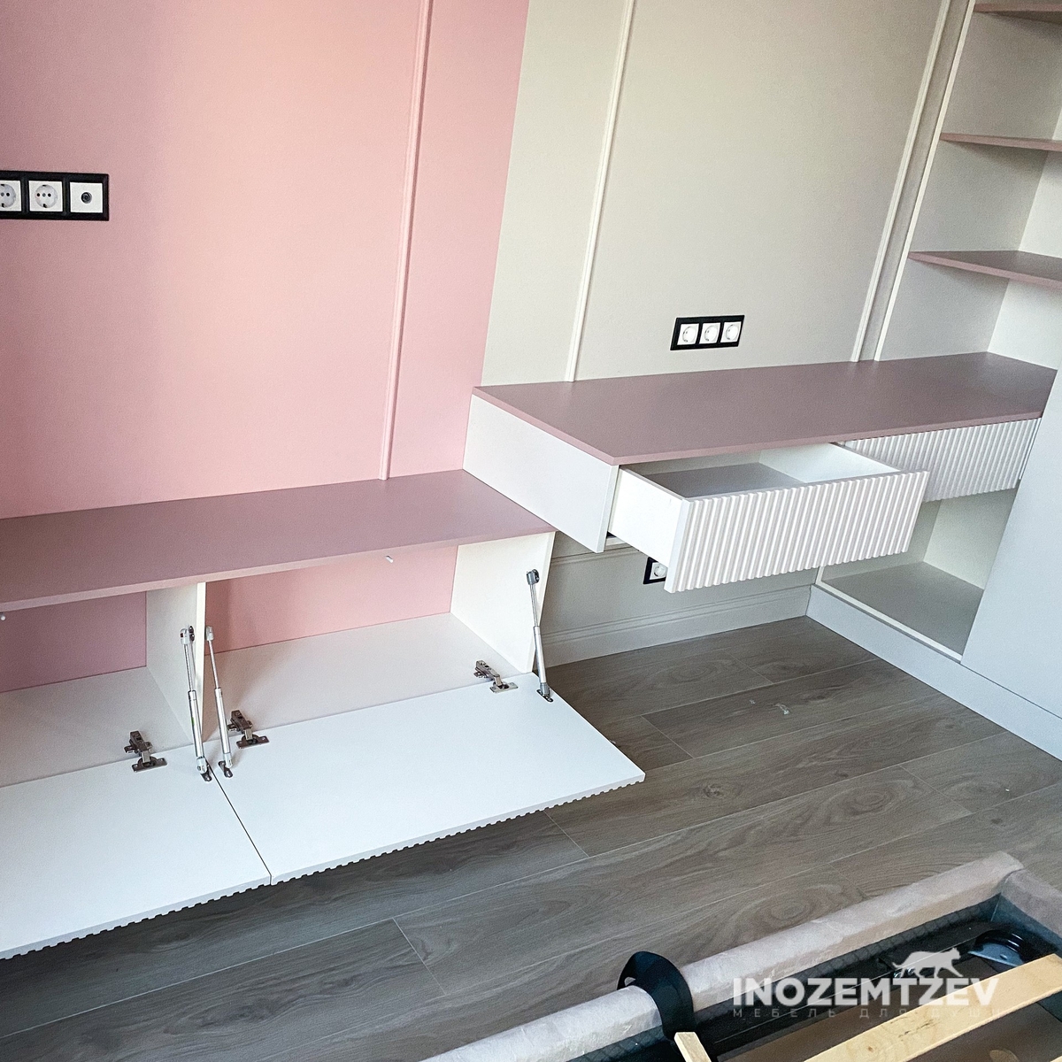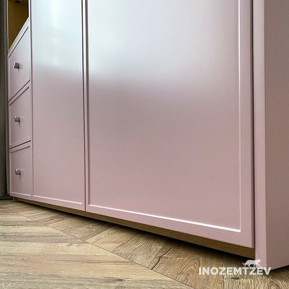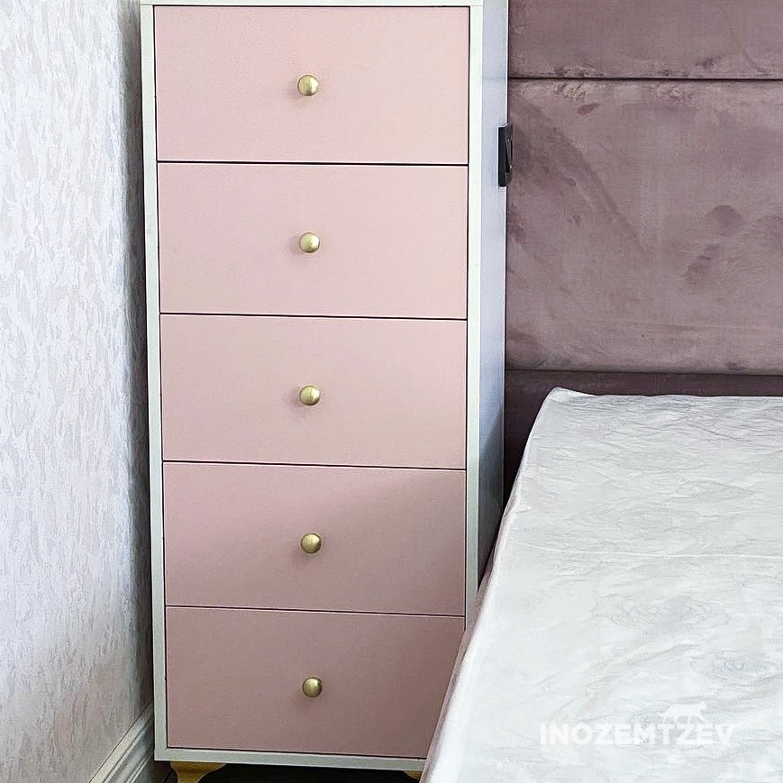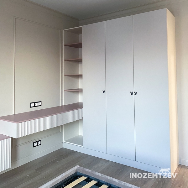 Детская мебель для девочки из МДФ в пленке ПВХ с 3D фрезеровкой в сочетании с ЛДСП Egger Розовый антик и Камель бежевый. Наполнение: ящики, полки, штанга.