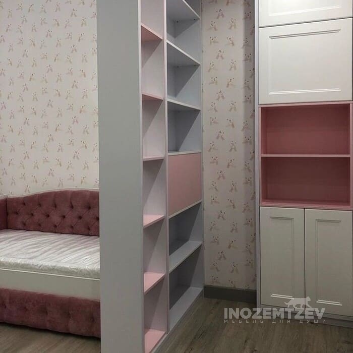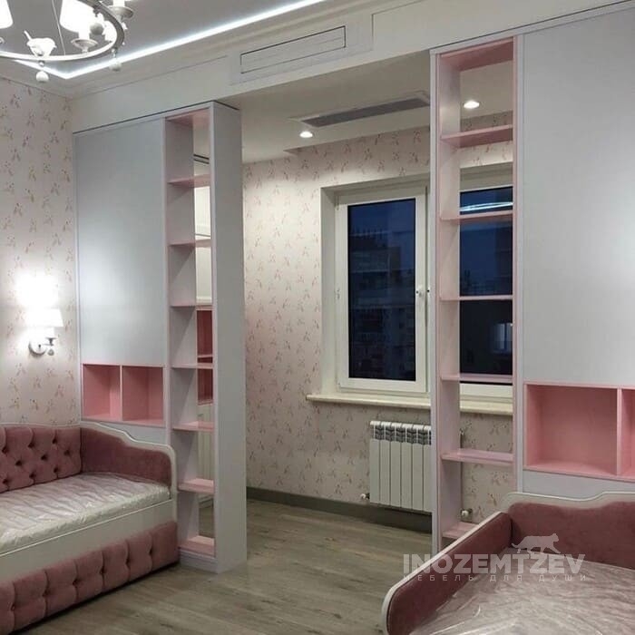 Шкаф для двух девочек и стеллажи-перегородки для зонирования пространства