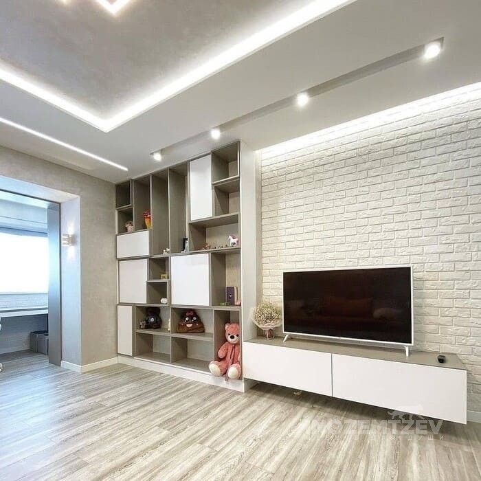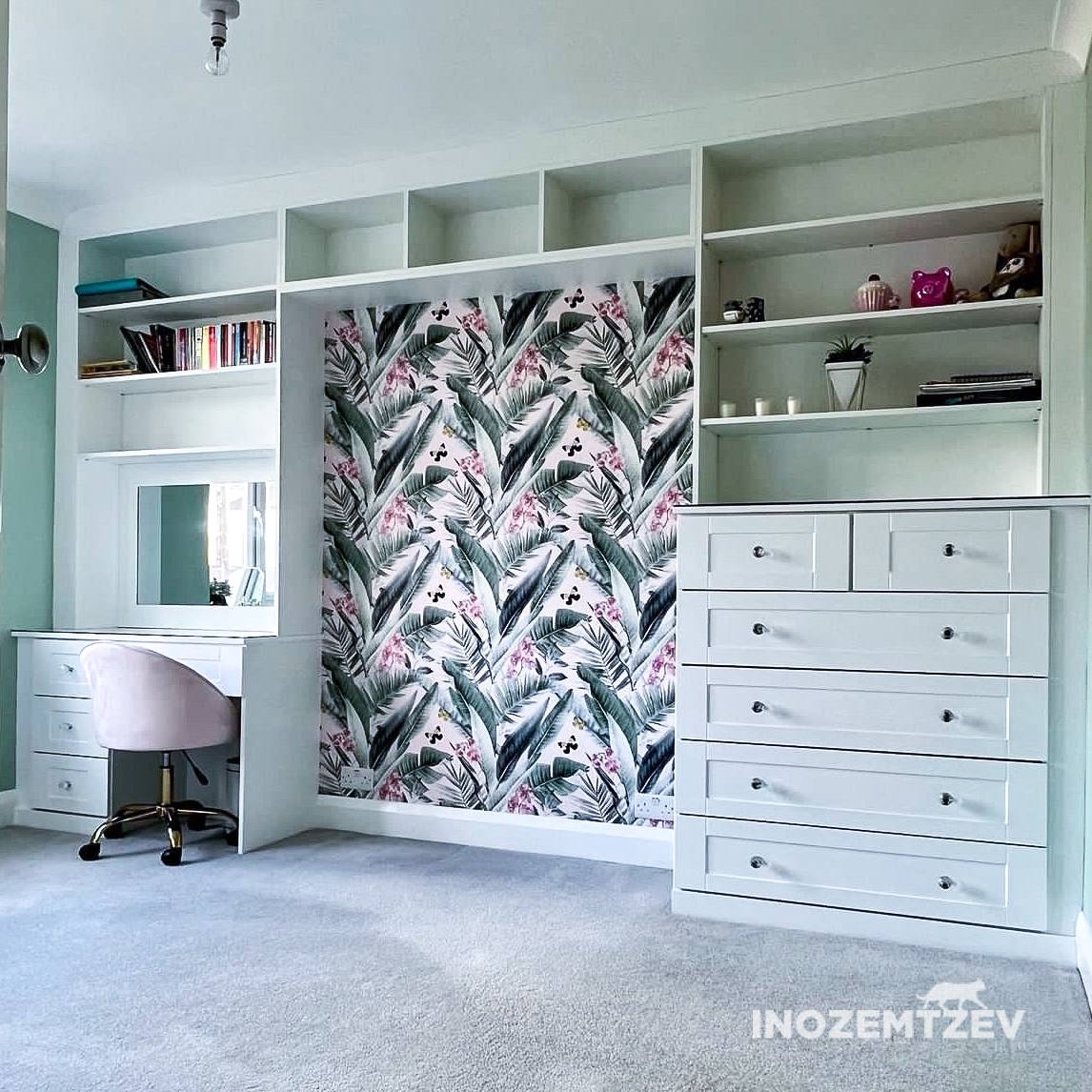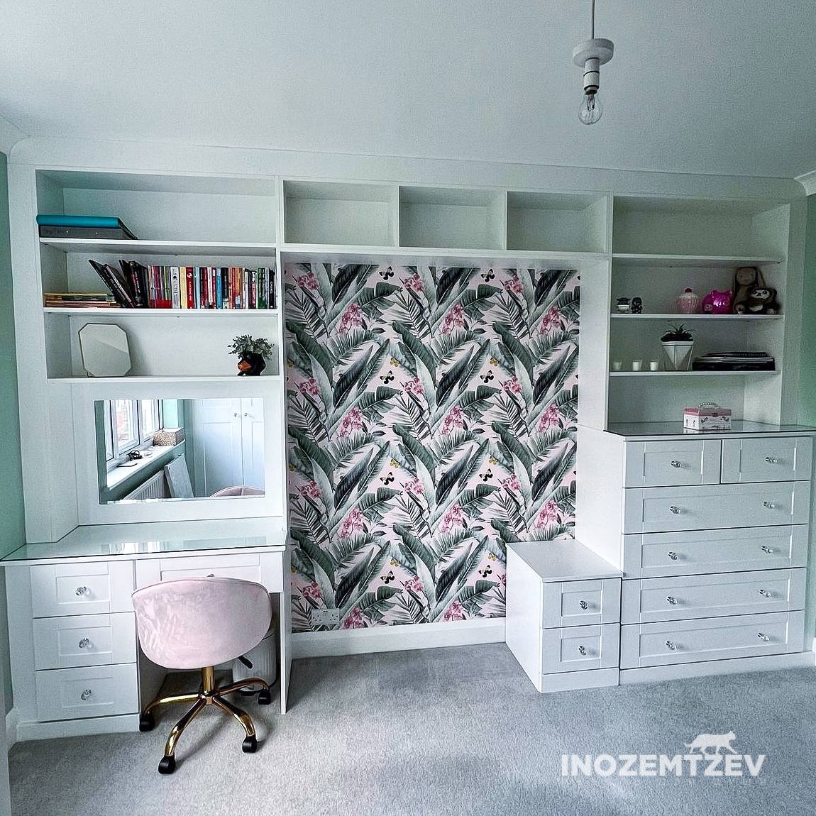 П-образная мебельная стенка в комнату девочки с туалетным столиком, зеркалом, открытыми полками и выдвижными ящиками, с нишей под телевизор