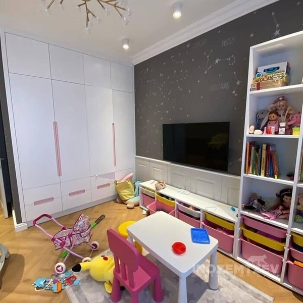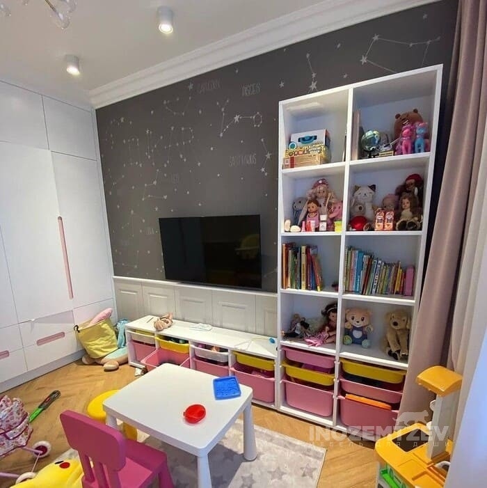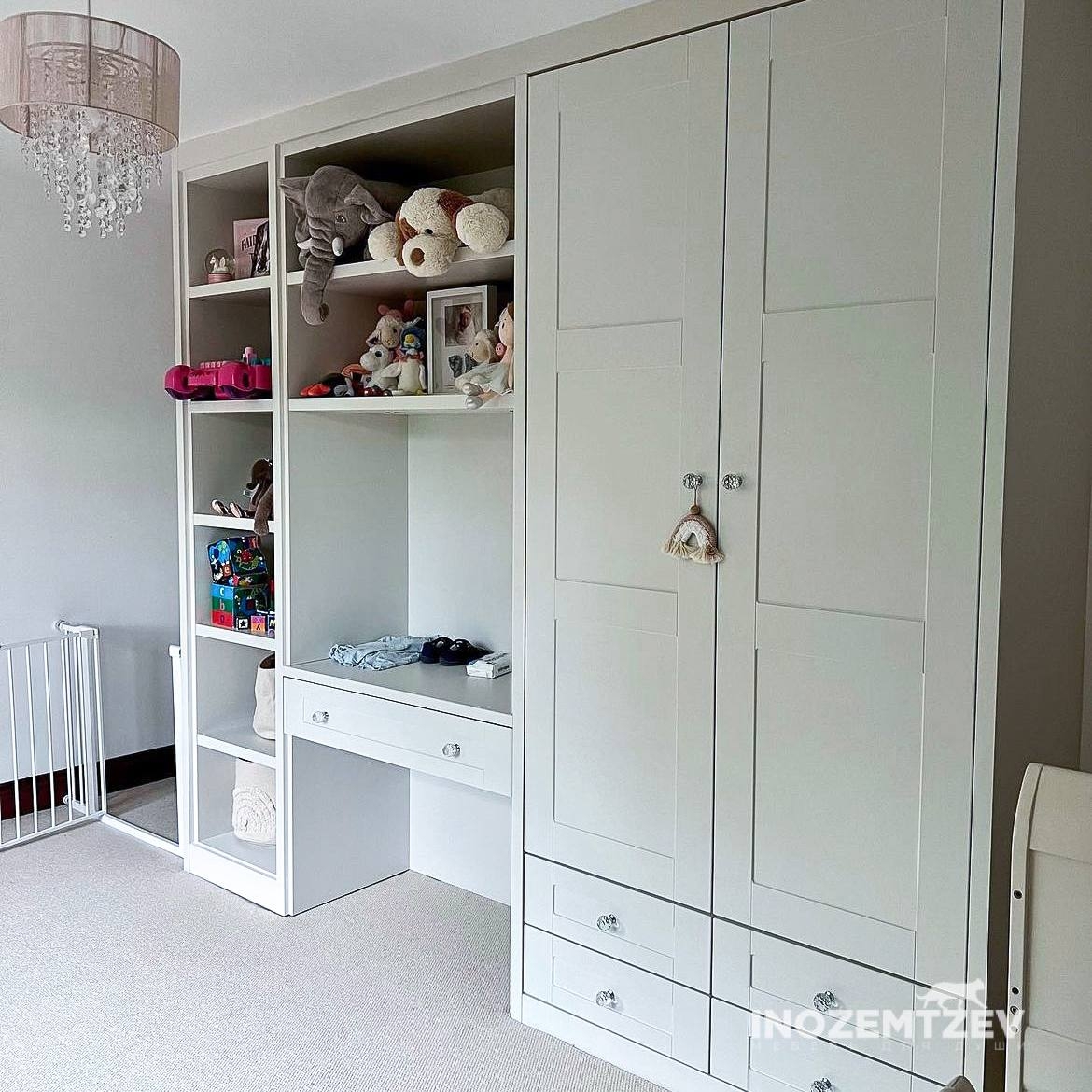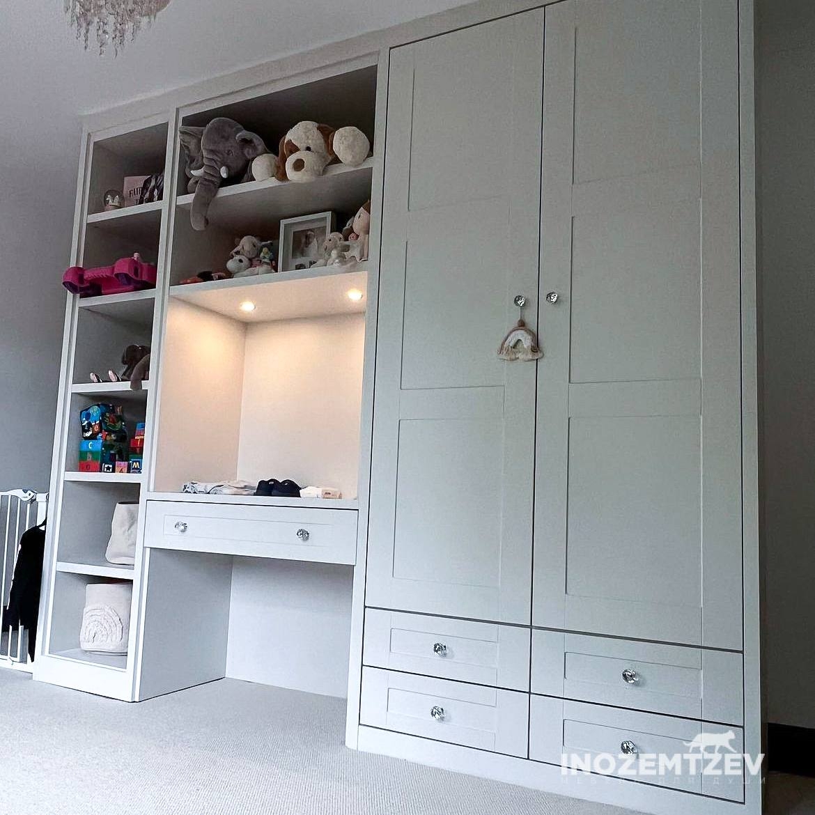 Шкаф для одежды для девочки и открытые полки для удобного хранения игрушек