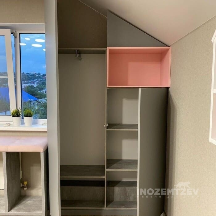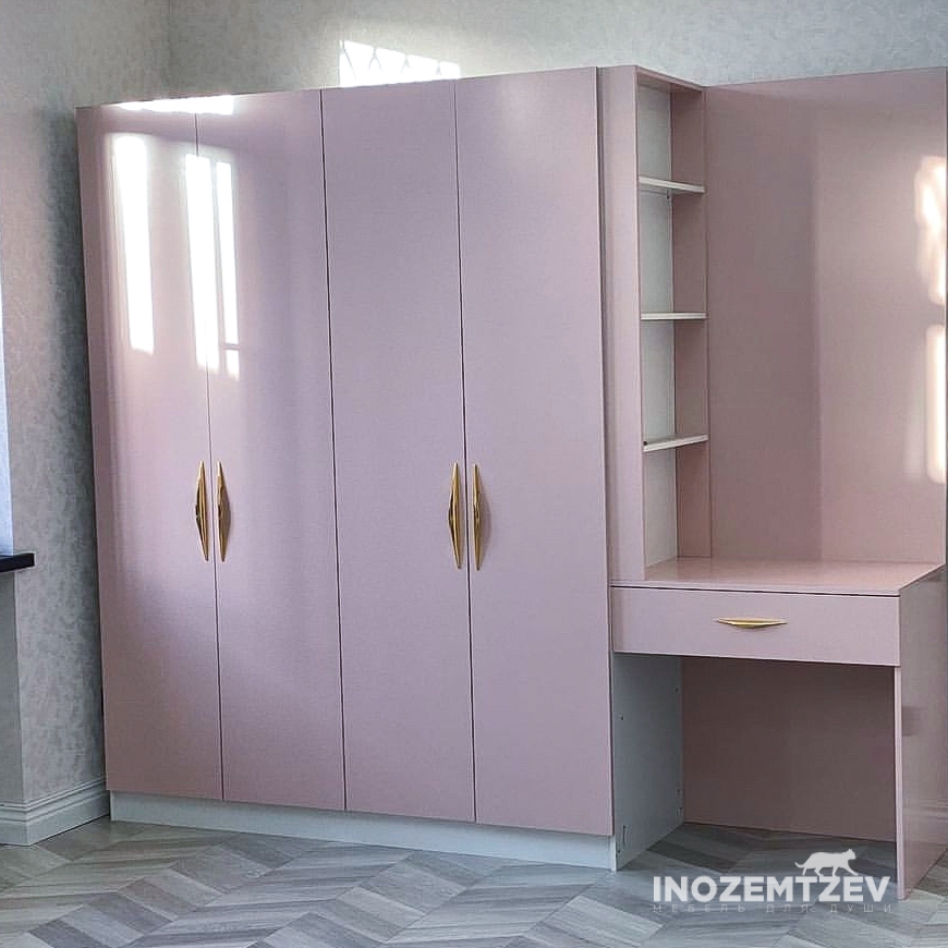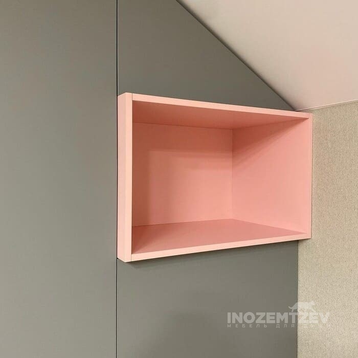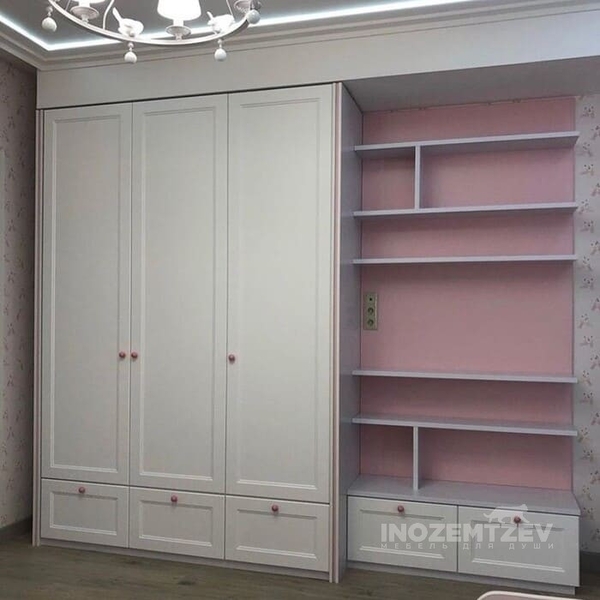 Нежный распашной шкафчик в розовом цвете с выдвижными ящиками, открытыми полками и антресолями в комнату девочки