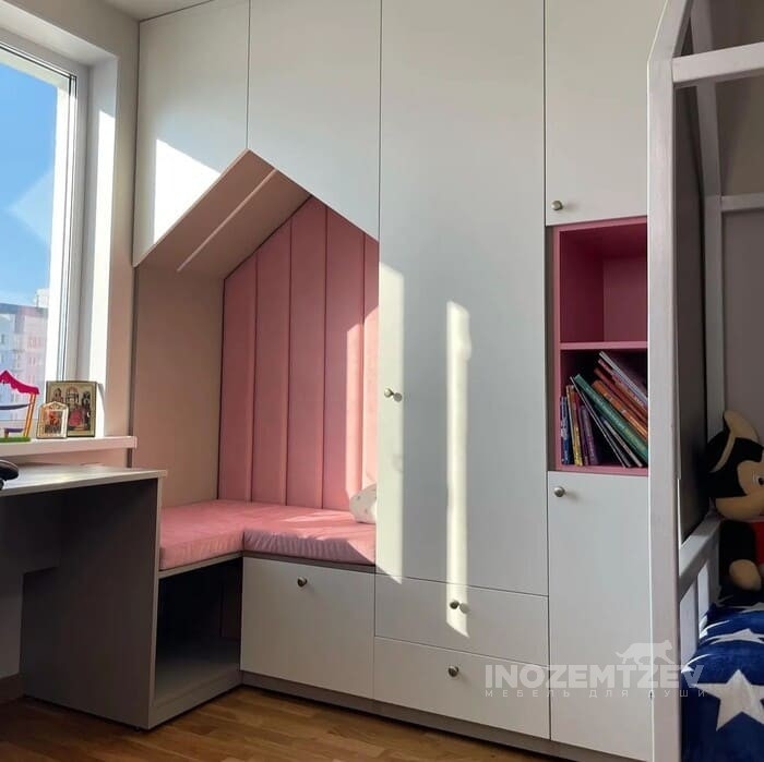 Мебель для детской комнаты девочке с письменным столом и мягкой сидушкой