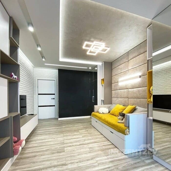 Комплект мебели для девочки с зеркальными шкафами, кроватью и стеллажами