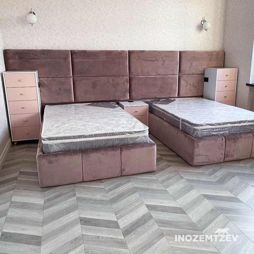 Мебель в комнату для двух девочек в розовом цвете: распашной шкаф с открытыми полками, кровати с мягким изголовьем и две тумбы с выдвижными ящиками